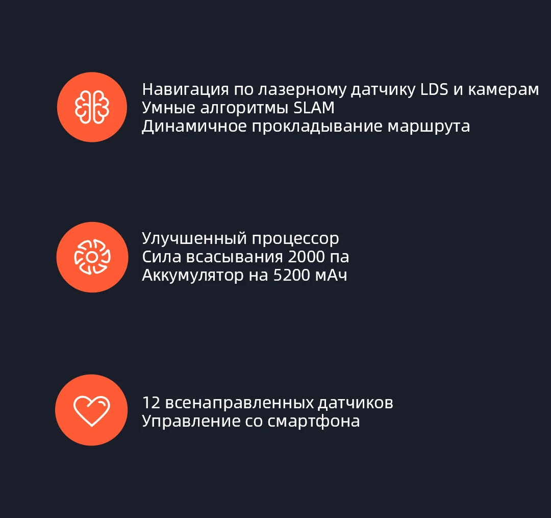 Революционное сочетание технологий навигации С помощью лазера LDS сканируется помещение, и составляется двухмерная карта, а визуальные датчики улавливают и распознают особенности изображения. На основе собранных данных составляется точная и надёжная карта помещения.