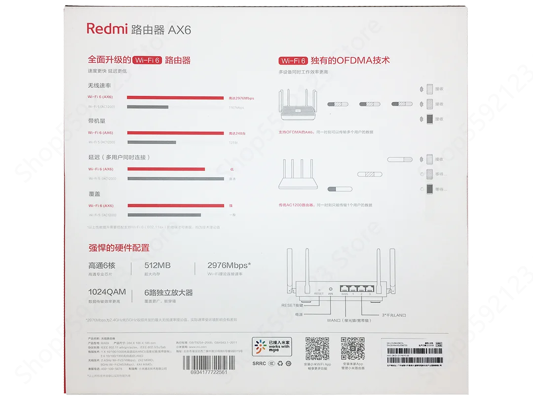 Длина, ширина и высота (одинарная): 284 × 186 × 186 мм Цвет изделия: белый Процессор: lPQ8071A4 core A531.4GHz CPU Двигатель сетевого ускорения: двухъядерный 1.7ггц NPU Память: 512 Мб 2,4G Wi-Fi: 2 × 2 (поддерживает протокол IEEE 802.11ax, теоретическая максимальная скорость может достигать 574 Мбит/с) 5G Wi-Fi: 4 × 4 (поддерживает протокол IEEE 802.11ax, теоретическая максимальная скорость может достигать 2402 Мбит/с) Антенна продукта: 6 внешних антенн с высоким коэффициентом усиления Тепловыделение продукта: Естественное тепловыделение Интерфейс машины: 1 10/100/100 Ом адаптивный WAN порт (Авто MDI/MDIX) 3 10/100/1000 м адаптивные LAN порты (Авто MDI/MDI×) Светодиодный индикатор: 2 (системный индикатор × 1, Интернет-индикатор × 1) Кнопка сброса системы: 1 Входной интерфейс питания: 1 Стандарт протокола: IEEE 802.11a/b/g/n/ac/ax, IEEE 802,3/3u/3ab Стандарты сертификации: ГБ/T9254-2008; GB4943.1-2011 Информация о гарантии: вся машина гарантирована на 1 год Беспроводные параметры: Двойная частота: 2,4 ГГц и 5 ГГц Беспроводной канал: 2,4 GHzChannel: 1,2,3,4,5,6,7,8,9,10,11,12,13 5 ГГц канал: 36,40,44,48,52,56,60,64, 149153157161165 Модуляция 11b: DsSS: DBPSK (1 Мбит/с), DQPSK (2 Мбит/с), CCK (5,5/11 Мбит/с) 11a/g: OFDM: BPSK (6/9 Мбит/с), QPSK (12/18 Мбит/с), 16QAM (24/36 Мбит/с), 64QAM (48/54 Мбит/с) 11n: MIMO-OFDM: BPSK, QPSK, 16QAM, 64QAM. Набор ставок: MCSO ~ MCS15 11ax: MIMO-OFDM: BPSK, QPSK, 16QAM, 64QAM, 256QAM, 1024QAM. Набор скоростей: MCSO ~ MCS11 (поддержка 4 потоков) 11ac: MIMO-OFDM: BPSK, QPSK, 16QAM, 64QAM, 256QAM Набор скоростей: MCSO ~ MCS9 (поддержка 4 потоков) Операционная система Параметры программного обеспечения: MiWiFi ROM, умная операционная система маршрутизатора глубоко настроена на основе OpenWRT Беспроводная безопасность: шифрование WPA-PSK/WPA2-PSK/WPA3-SAE Беспроводное управление доступом (черный и белый список), SSID скрытая, интеллектуальная сеть против царапин Приложение управления: поддержка веб, Android, iOS Рабочая среда Температура рабочей среды: ~ 40 ℃ Рабочая влажность: 10% ~ 90% относительной влажности (без конденсации) Температура хранения: -40 ~ 7o ℃ Влажность хранения: 5% ~ 90% относительной влажности (без конденсации)