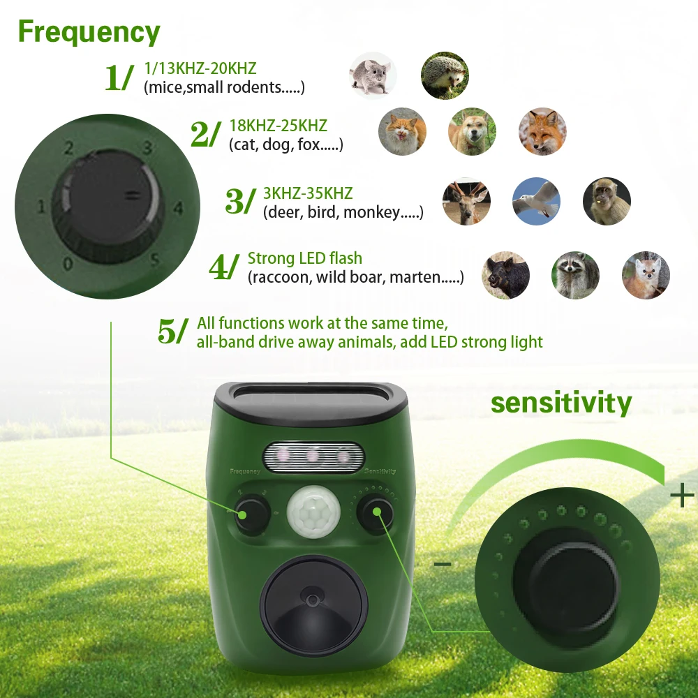 Этот продукт использует принцип инфракрасного обнаружения, чтобы излучать ультразвук при обнаружении животного, и светодиодный индикатор мигает, чтобы управлять животным. Это может помочь вам держаться подальше от притеснений животных и защитить ваш патио, сад и т. Д. Этот продукт предназначен только для вождения животных, не содержит химических веществ и не наносит вреда человеческому организму.