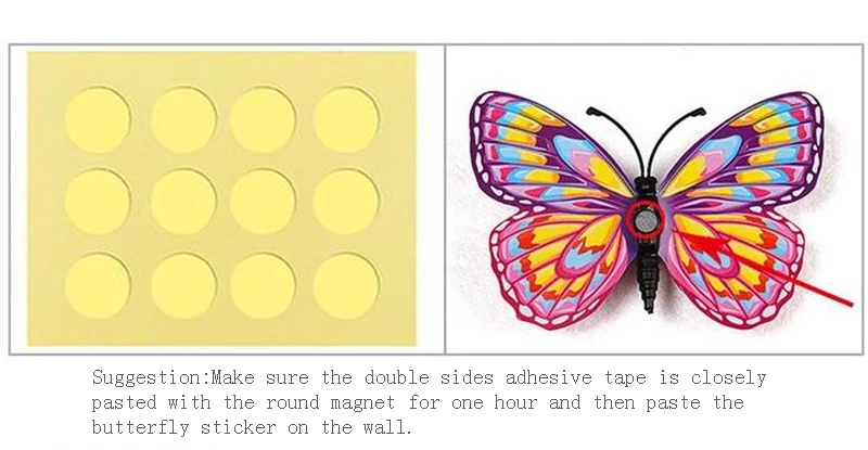 Название бренда: lachuffe Товар: креативный настенный стикер в стиле бабочки с двумя крыльями синего цвета Материал: ПВХ Размер: как на картинке Вес: 40 г Посылка в комплекте: 12 шт. Особенность 1:100% Новые Фирменные и высокого качества Особенность 2: горячая распродажа креативных 3D стильных настенных наклеек с двумя крыльями бабочки синего цвета Особенность 3: отсутствие раздражающего запаха/водонепроницаемый/легко наклеивается Особенность 4: магнит прикреплен и наклеен с двухсторонней клейкой лентой Он может быть нанесен на любую гладкую, чистую и сухую поверхность стен, автомобилей, плитки, стекла, мебели и т. д., не подходит для грязной или шероховатой поверхности. Предложение: Убедитесь, что Двухсторонняя клейкая лента плотно приклеивается круглым магнитом В течение одного часа Наклейте наклейку бабочки на стену.