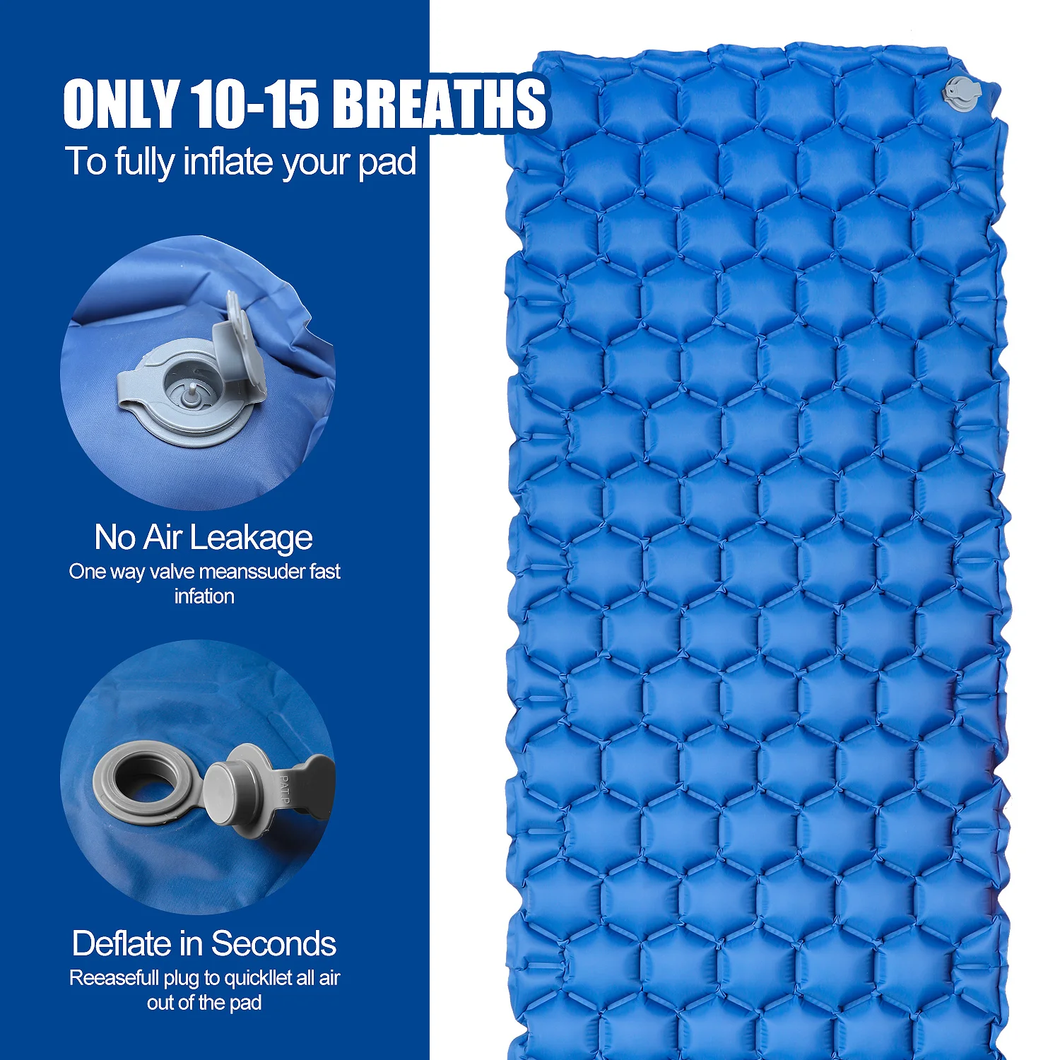 • Наслаждайтесь ночным отдыхом в кемпинге: больше не болит в спине или не раздражает дискомфорт от каждой маленькой скалы или веток листьев внизу! Самонадувающийся сверхлегкий спальный коврик использует индивидуальные (но взаимосвязанные) воздушные клетки, которые динамические боковые рельсы для спокойного сна могут поддерживать комфорт для зимних условий.