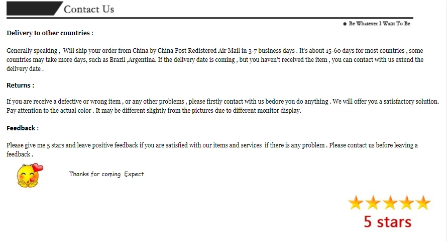 1. Normalmente, spediremo i prodotti fuori in 1 day il più presto possibile, e il pacchetto arriverpara in 7-30 jorni! Se non può arrivare in 60 jorni, noi siamo responsabili per esso, da rispedizione calze a voi o rimborseremo i soldi a voi. 2. Se abbia qualunque problemi, si prega di non esitate a contattarci, e noi siamo qui tutti i yooni solo per voi. Faremo del nostro meglio per aiutare voi! 3. Искренная Грация для детей. Desiderio avete un jorno piacevole!