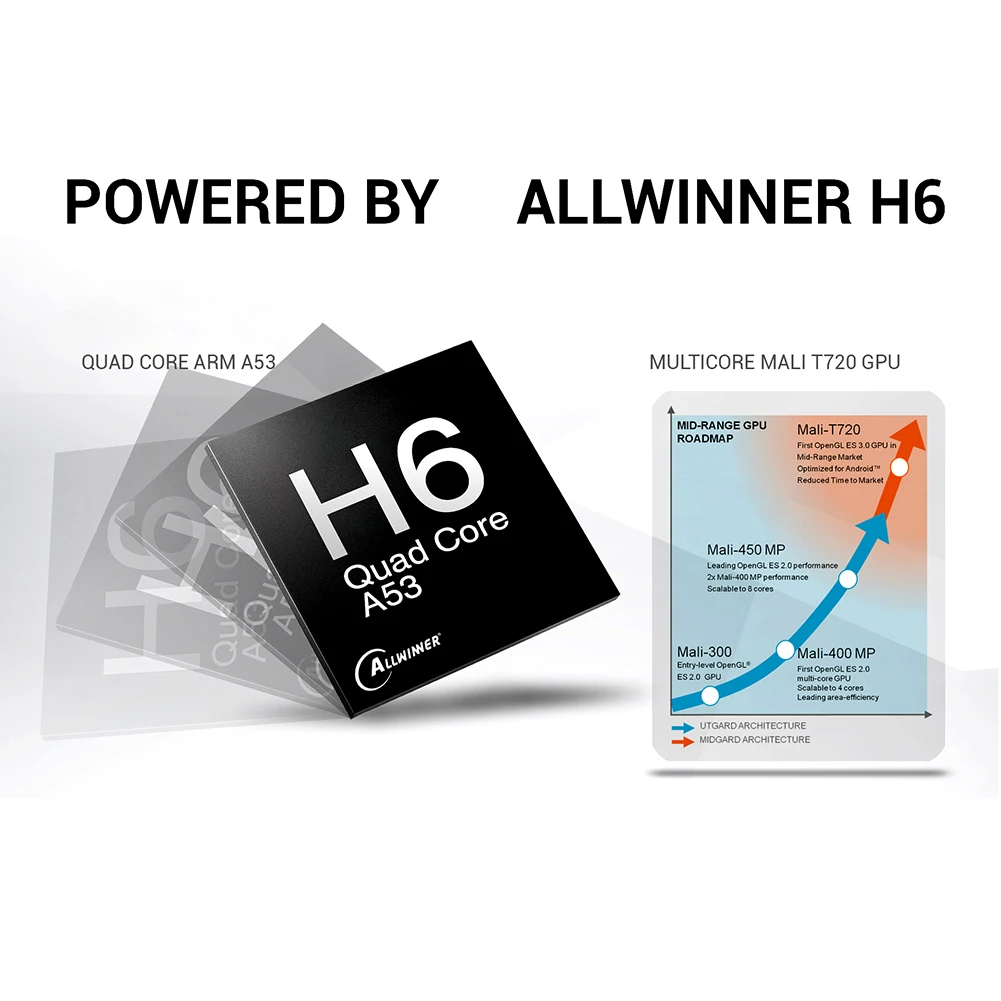 Особенности: 1: Процессор (Allwinner H6, до 1,5 ГГц, четырехъядерный процессор ARM Cortex-A53); 2: Графический процессор (Mali-T720); 3: ОЗУ (2G DDRIII) 4: ПЗУ (16 Гб) 5: Wi-Fi (2,4 г); 6: Lan (порт Ethernet RJ45 (100 м); 7: SPDIF коаксиальный (оптический); 8: USB-хост (1 USB 3,0, 2 USB 2,0, поддержка U-диска и USB HDD); 9: картридер (устройство для чтения tf-карт); 10: постоянный ток, 5 в пост. Тока/2 А; 10: O.S. (Android 9,0);