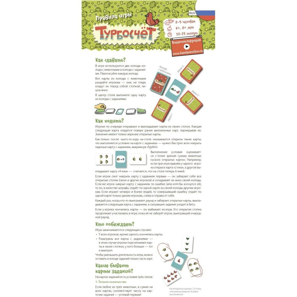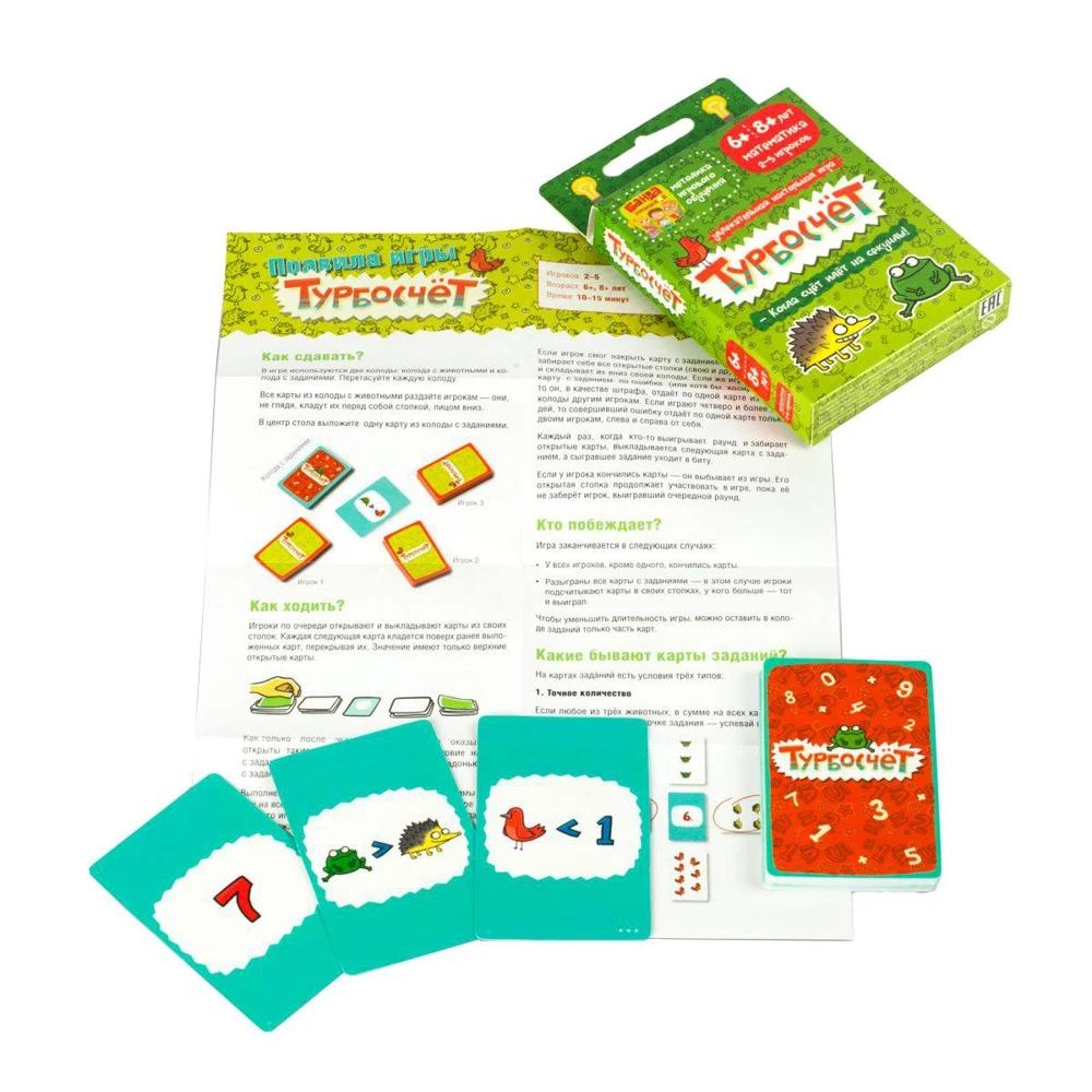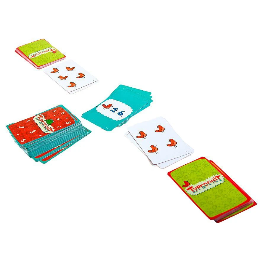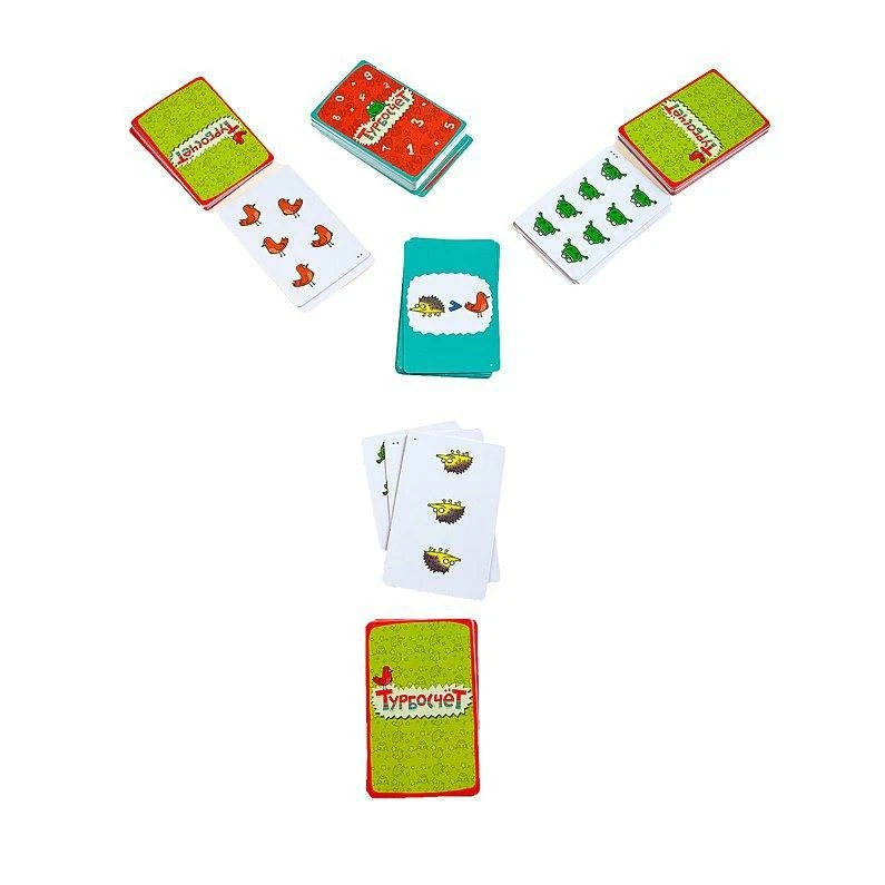 "Турбосчет" — это захватывающая настольная игра для детей от 6 лет. Учиться считать, складывать и сравнивать числа со скоростью света — легко! Просто, как раз-два-три. Кто быстрее подсчитал ежей и птиц — кричит "Турбо!" и собирает урожай!