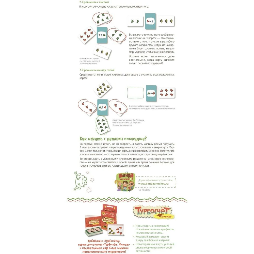 "Турбосчет" попутно развивает внимательность, логику, скорость мышления и реакции. "Турбосчет" имеет продолжение — "Турбосчет Форсаж", в нем придется решать задачки посложнее. Карты этой игры можно постепенно добавлять к "Турбосчету", усложняя его, а можно использовать как самостоятельный игровой набор.
