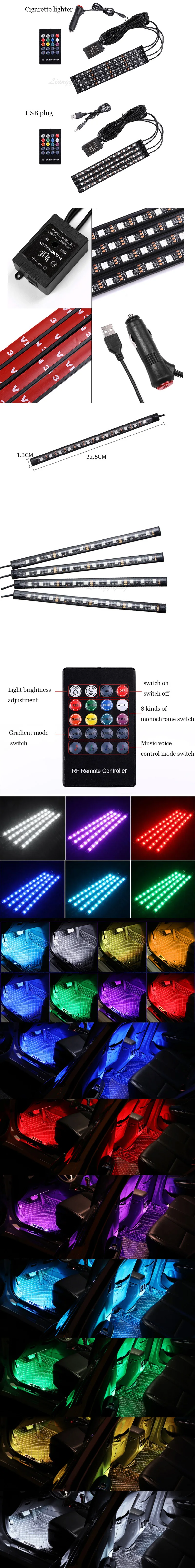 Specifications: Romote Control Brand new and high quality This is about one set of decoration light, including 4 pieces lights one cigarette lighter or usb and one remote control . Simple design for you a beautiful, exotic and romantic interior. Double-side adhesive tap available for installation. It can be used on the car interior floor or dash. Speical Features:Wireless Control decoration light Wireless Control: Music/voice control Remote Function: on/off,change color,change flashing pattern,change flshing speed Voltage: USB is 5v,Cigarette lighter is 12v Light Color:Colorful Description: Wireless music control 7 color RGB car interior lights kit. High quality RGB LED strip lights, waterproof, anti-collision, anti-corrosion. Wireless IR control, change the color as you wish.(Remote control needs to be aligned with signal line control) Also comes with music control mode, makes your car more attractive. Control mode: 16 signal color control, brightness control, ON/OFF, 2 jump mode control, 2 fade mode control Installation: Directly to the product configuration into the cigarette lighter socket cigarette lighter socket can be, without any wires modification. Package Contents: 1 set Light Notice: the battery is not included