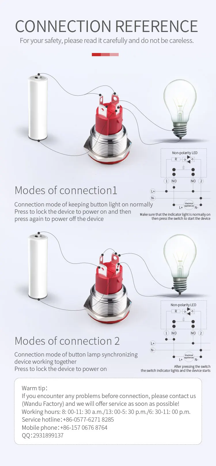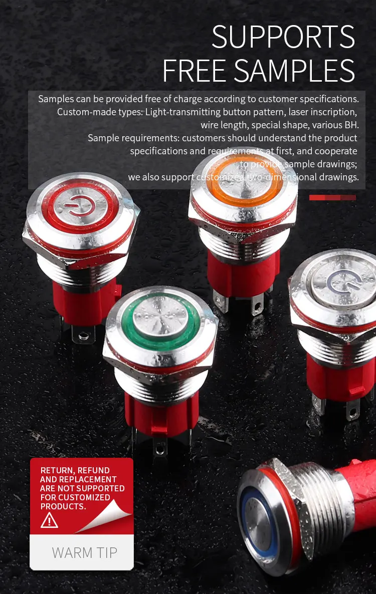 1. Эта модель серии ламп WD19D с диаметром отверстия 19 мм; 2. Корпус изготовлен из нержавеющей стали. Если вам нужны другие материалы, пожалуйста, свяжитесь со службой поддержки клиентов. 3. Водонепроницаемый/Пылезащитный/коррозионная стойкость/термостойкость; Высокая механическая жизнь, гарантированное качество; 4. Номинальная грузоподъемность 10А/250В переменного тока; 5. Микро SMT СВЕТОДИОДНЫЙ светильник и резистор, встроенный понижающий резистор; 6. Тип ключа: плоская головка с кругом светильник; Плоский кольцевой источник питания; 7. Светящийся цвет: красный, зеленый, синий, желтый и белый; 8. Напряжение лампы: Широкое напряжение 3-6 в 12-24 в 36-48 в 110-220 В; 9. Самоблокирующиеся/самоблокирующиеся варианты: Самодублирующая операция: нажмите вниз, чтобы включить, отпустите кнопку для сброса. Самоблокировка: Нажмите кнопку блокировки, чтобы включить, а затем нажмите кнопку отключения для сброса 10. Тип контакта по умолчанию этого переключателя: 1NO; 11. Различные характеристики терминалов и стыковочные заглушки могут быть настроены в соответствии с требованиями заказчика; 12. Особое внимание: индивидуальные продукты не подлежат возврату или замене. Если у вас есть какие-либо вопросы, пожалуйста, позвоните 15706768764.