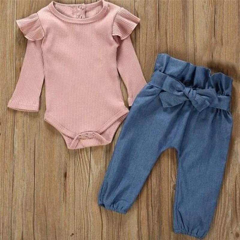 Детский костюм из 2 предметов Модный комплект одежды для маленьких девочек, розовая и бежевая футболка Топы + джинсовые штаны