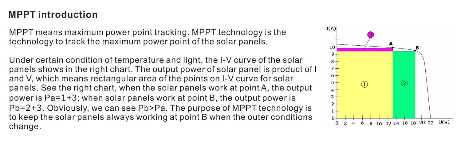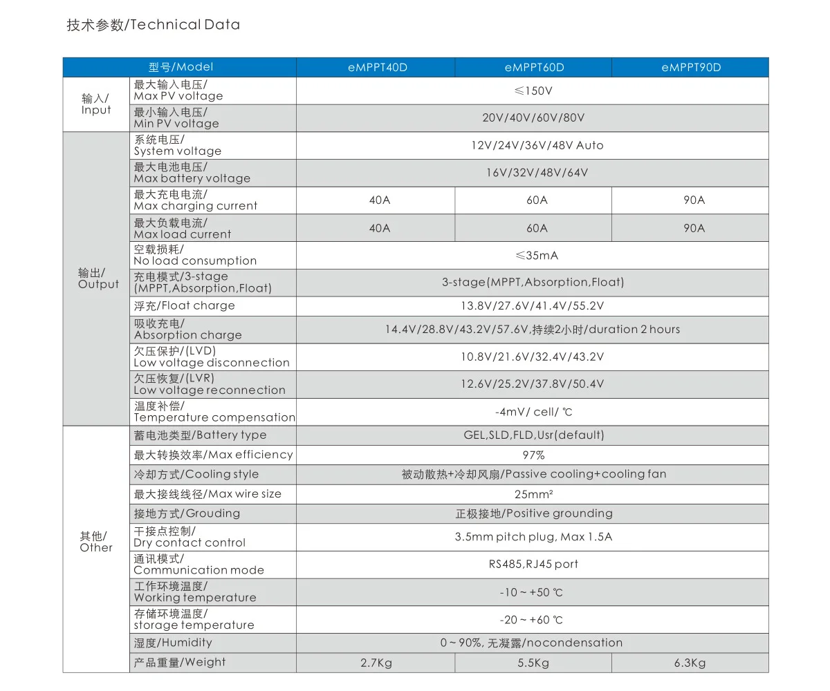 Контроллер солнечного заряда eMPPT-это многоступенчатое отслеживание максимальной мощности (MPPT) Фотоэлектрический Контроллер заряда батареи с нашей собственной технологией. Это главная топология принимает в конверсии Buck и использует MCU для регулировки рабочих точек солнечных панелей, чтобы сделать солнечные панели выходными своей максимальной мощностью. Когда обстоятельства меняются, Рабочая точка солнечных панелей отклоняется от максимальной точки питания, MCU будет регулировать солнечную Рабочая точка панелей на основе расчета MPPT, чтобы сделать солнечные панели снова до максимальной точки питания. По сравнению с PWM контроллером, MPPT контроллер может увеличить выходную мощность солнечных панелей на 5% ~ 30%. Увеличение удельной мощности зависит от таких факторов, как свойства солнечных панелей, влажность и интенсивность. Контроллер использует установку настенного крепления. Соединительный терминал делает область проводки больше и потери проводки меньше.