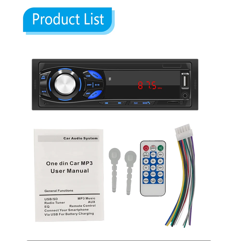 Feature: 1. Radio (FM) 2. Card reader, U disk (audio) 3. AUX function 4. RCA audio output can be connected to a subwoofer Specification: Model: 1044 Voltage: 12V Type: Car MP3 OS: No Configuration: LED Software Solution: Jieli Screen model: LED digital tube Screen size: No Screen resolution: No Panel size: 188 * 58mm/7.40*2.28" Освещение панели: синий Размер цветной коробки: 200*75*210 мм/7,87*2,95*8,27" Глубина: 60 мм/2,36" Вес нетто: 330 г Подключение телефона: нет Gps-навигация: нет Радио диапазон: FM Радиочип: интегрированный Язык: нет Мощность: 45 Вт Рабочая температура: -10 ~ + 60 °C Изображение заднего хода: нет Функция подсказки тормоза: нет Функция управления рулем: нет Модель Bluetooth: Да Чип усилителя: YD1028 Радиочастота: 87,5 ~ 108 МГц Видеовыход: нет Зеркальное отображение экрана: нет Встроенная автономная карта: нет Мобильный Интернет: нет Беспроводной WIFI: нет Слот для tf-карты: Да Слот для карты GPS: нет Пульт дистанционного управления: пульт дистанционного управления Пульт дистанционного управления рулем: нет Интерфейс USB и версия: передняя панель USB2.0 Кнопка сброса: Нет Кнопки: Физические кнопки Введение терминала RCA: 2 аудиовыхода Передний AUX аудио вход: Да Функция DVR: нет Функция DAB: нет Функция OBD: нет Функция ТВ: нет Модель DVD: нет 4G / 3G: нет Замена логотипа автомобиля: нет Поддерживаемый Формат аудио: MP3 Поддерживаемый Формат видео: нет Поддерживаемый Формат изображения: нет Заводская Настройка пароля: Нет Примечание: 1. Возможны незначительные отклонения в размере из-за ручного измерения, различных методов измерения и инструментов. 2. Изображение может не отражать фактический цвет изделия из-за различных фотографирования светильник, угол и дисплей монитора. 1 пульт дистанционного управления 1 х Кабель питания 2 X Инструменты для удаления 1 х Руководство