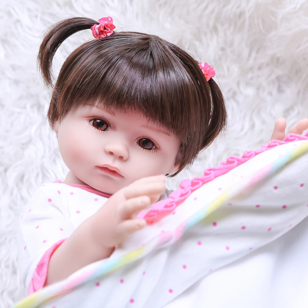 Размер: около 48 см Вес: вес нетто составляет около 1,1 кг Материал: изготовлена из импортного силикона, мягкая на ощупь; Кукла может сидеть или лежать, не стоя; Кукла может купаться вместе с малышом в воде Глаза: высококачественные акриловые глаза, сделанные в Тайване, глаза не будут мигать Волосы: приклеить парик.