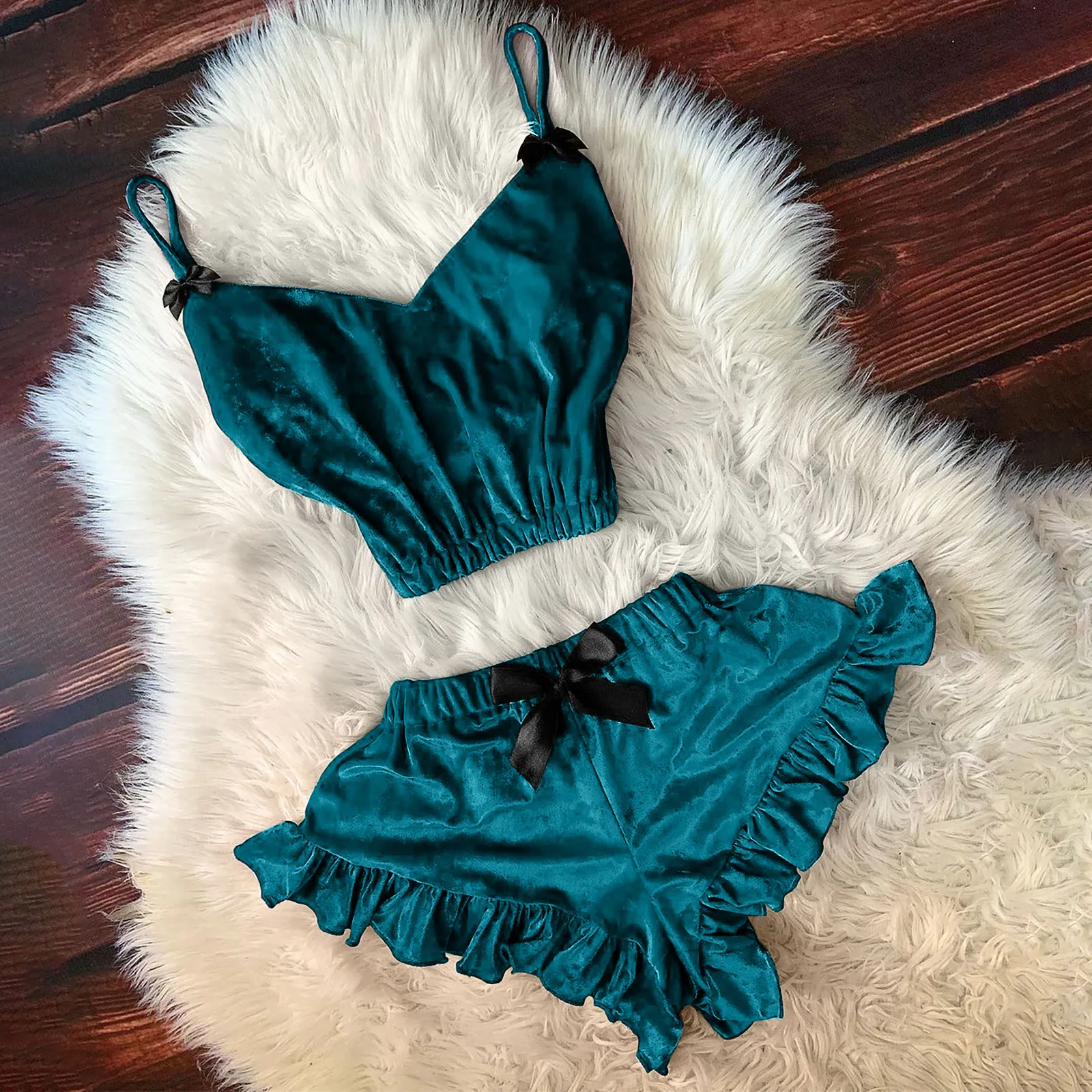 Женский бархатный сексуальный топ с v-образным вырезом, пижамные шорты с бантиком