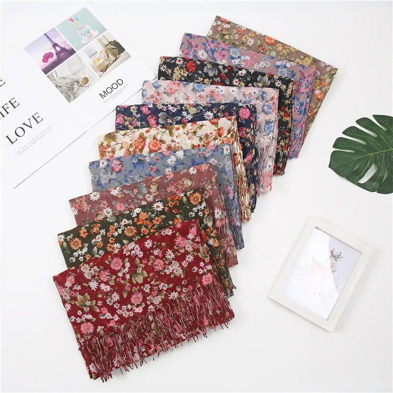 Новый женский шарф с принтом, весна-лето, кондиционер, шаль, корейский стиль, Цветочный, с бахромой, длинный хлопковый и льняной шарф