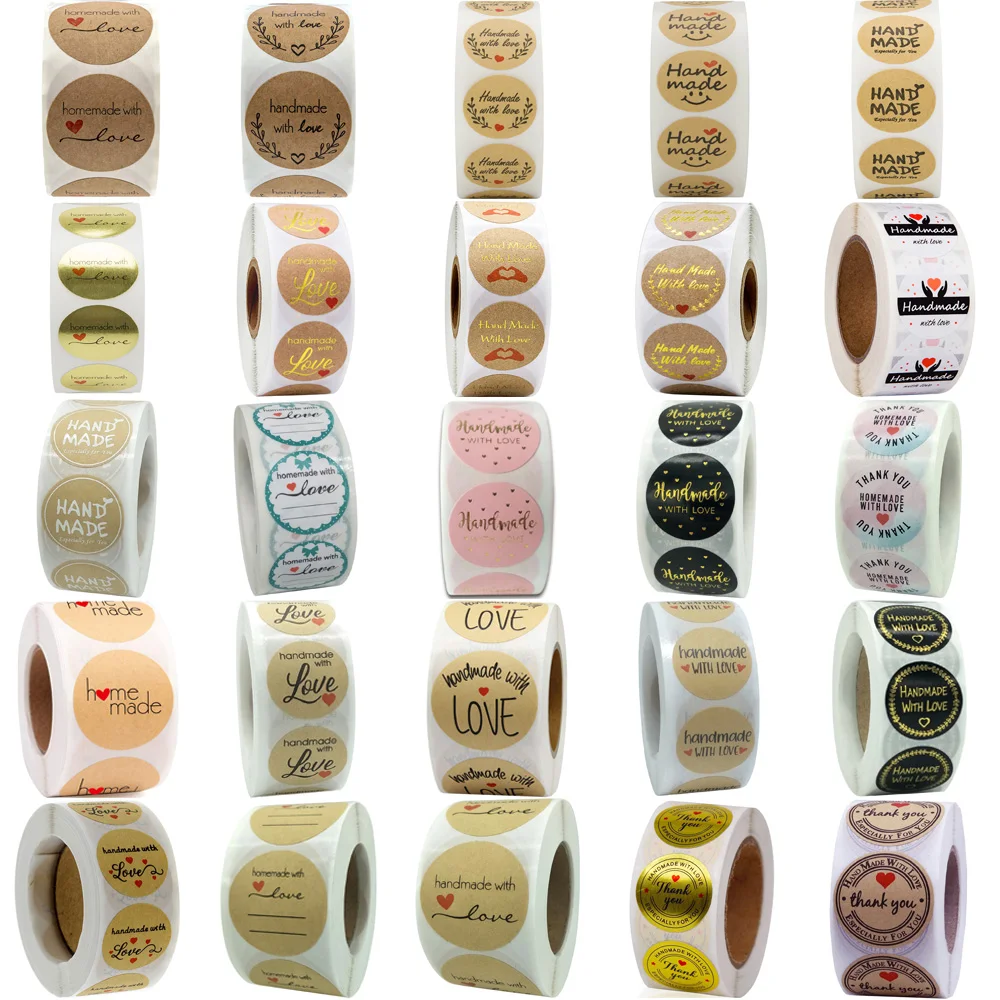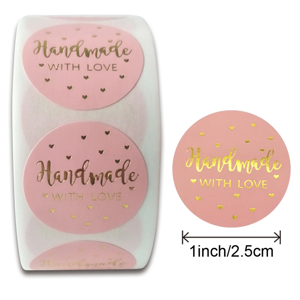 Круглые наклейки ручной работы с любовью, розовые белые крафтовые черные наклейки ручной работы с черным золотым шрифтом и красным сердцем, этикетки для пакетов