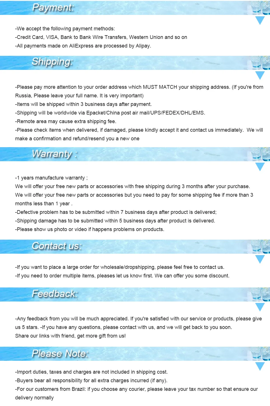 В последнее время некоторые клиенты сообщили, что на китайском языке имеется только руководство, но руководство на английском языке отсутствует. Мы глубоко приносим извинения за это, потому что оригинальная посылка только организует руководство на китайском языке. Для решения этой проблемы наш магазин специально перевел руководство на английском языке для вас. Если это удобно для вас, пожалуйста, оставьте свою контактную информацию, и мы вышлем вам электронную версию переведенного руководства на английском языке. Если у вас есть требования к инструкциям на других языках, пожалуйста, свяжитесь с нами, и Мы переведем руководства на нужный вам язык.