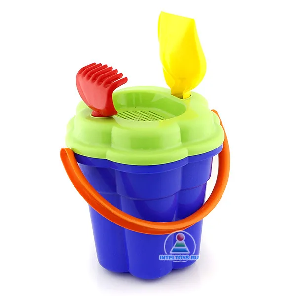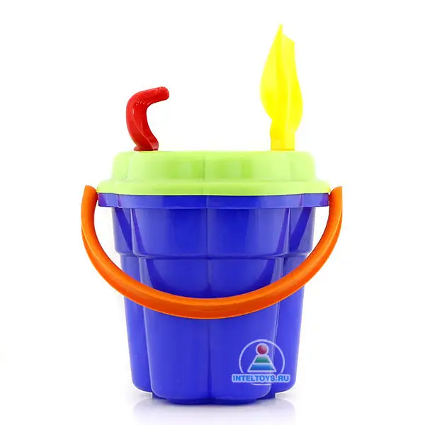 В фигурном ведерке с большой ручкой очень удобно носить песок, а также хранить формочки, игрушки и небольшие инструменты для копания.