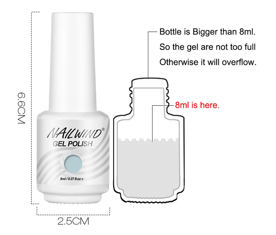 1. Объем составляет 8 мл. Поскольку емкость бутылки составляет более 8 мл, гель для ногтей не будет полностью заполнен бутылкой!