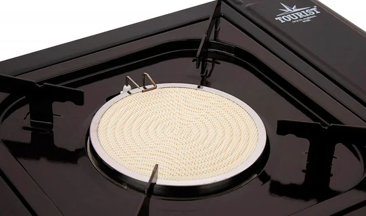 В конструкции плитыKeramik Guru Plus TS-201используется горелка с керамической поверхностью, в которой сгорание газа происходит не в открытом пространстве, как у плит со стандартными горелками,а в и над цилиндрическими сотамипо всей поверхности керамического материала. При этом, первоначальному нагреву подвергается керамический материал горелки, который и излучает тепло. Таким образом, на верхней поверхности керамической горелки равномерно распределяется излучение тепла. Кроме того, снижается общий расход топлива на фоне увеличения КПД самого прибора.