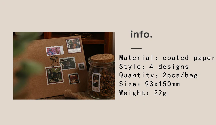 Материал: мелованная бумага Стиль: 4 дизайна Количество: 2 шт./пакет Размер: 93x150 мм Вес: 22 г