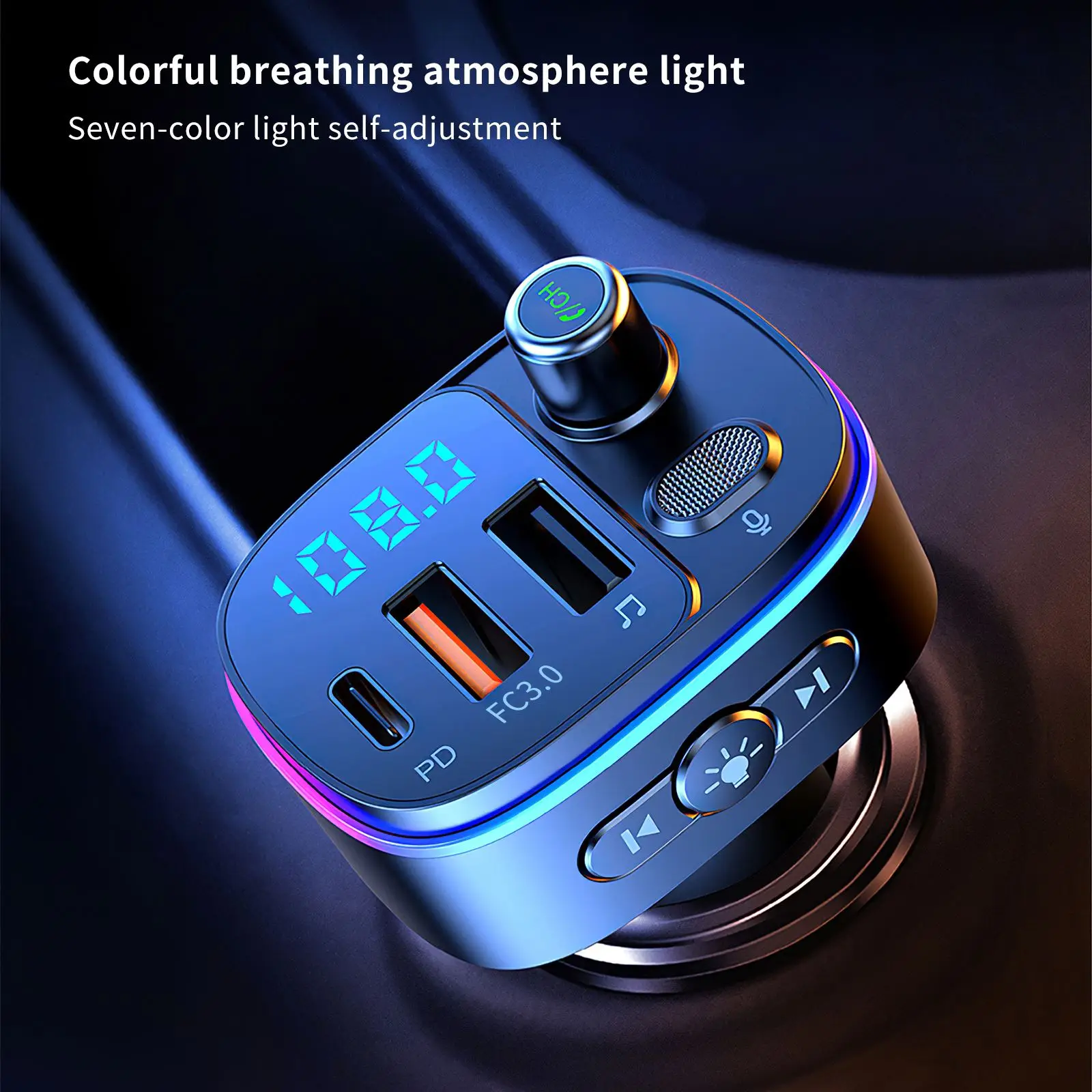 Это автомобильное зарядное устройство является многофункциональным, оно имеет функцию Bluetooth, так что оно может соединиться с вашим телефоном для воспроизведения любой музыки, которая вам нравится. Он также имеет красосветильник, добавляет атмосферу.