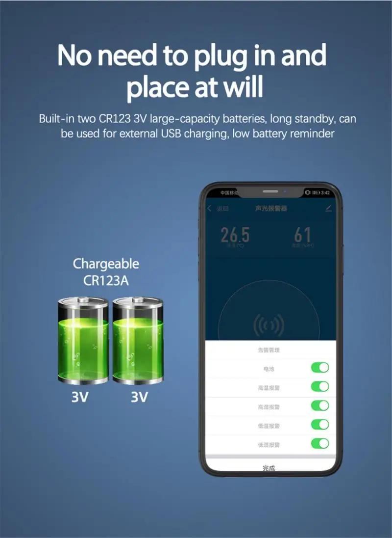 Температура и влажность звук и светильник сигнализации Измерение температуры и влажности | Интеллектуальная связь с высокой подачей alarm | Дистанционная сигнализация Высокоточное измерение Удаленный просмотр приложения, состояние устройства четкое с первого взгляда Высокочастотный звуковой сигнал, удаленный звук и светильник, сигнал тревоги, отгоняйте плохих парней Подключение оборудования, ощущение smart, когда температура в помещении слишком высока, кондиционер/Электрический вентилятор автоматически запустится