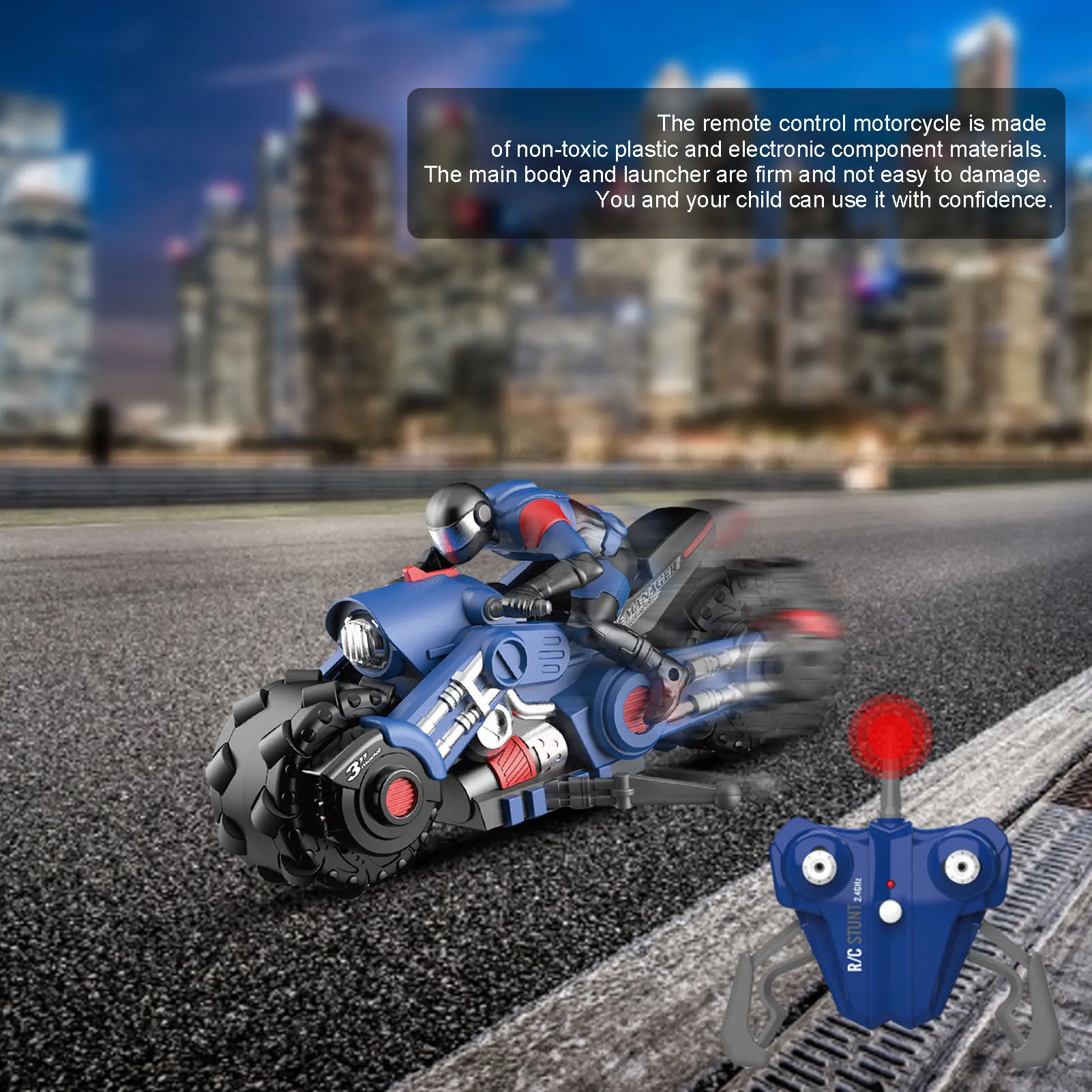 2. Мотоцикл с дистанционным управлением изготовлен из нетоксичного пластика и электронных компонентов. Основной корпус и передатчик прочные и не легко повреждены. Вы и ваши дети можете использовать его с уверенностью.