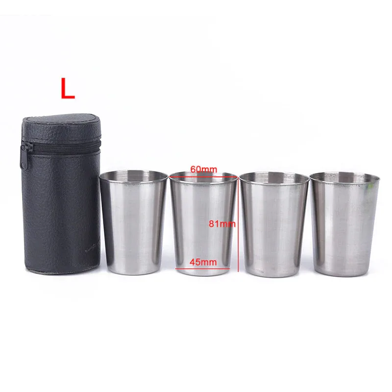 Набор туристических стопок 30/60/150 мл из нержавеющей пищевой стали 4 шт в чехле из кожзама.