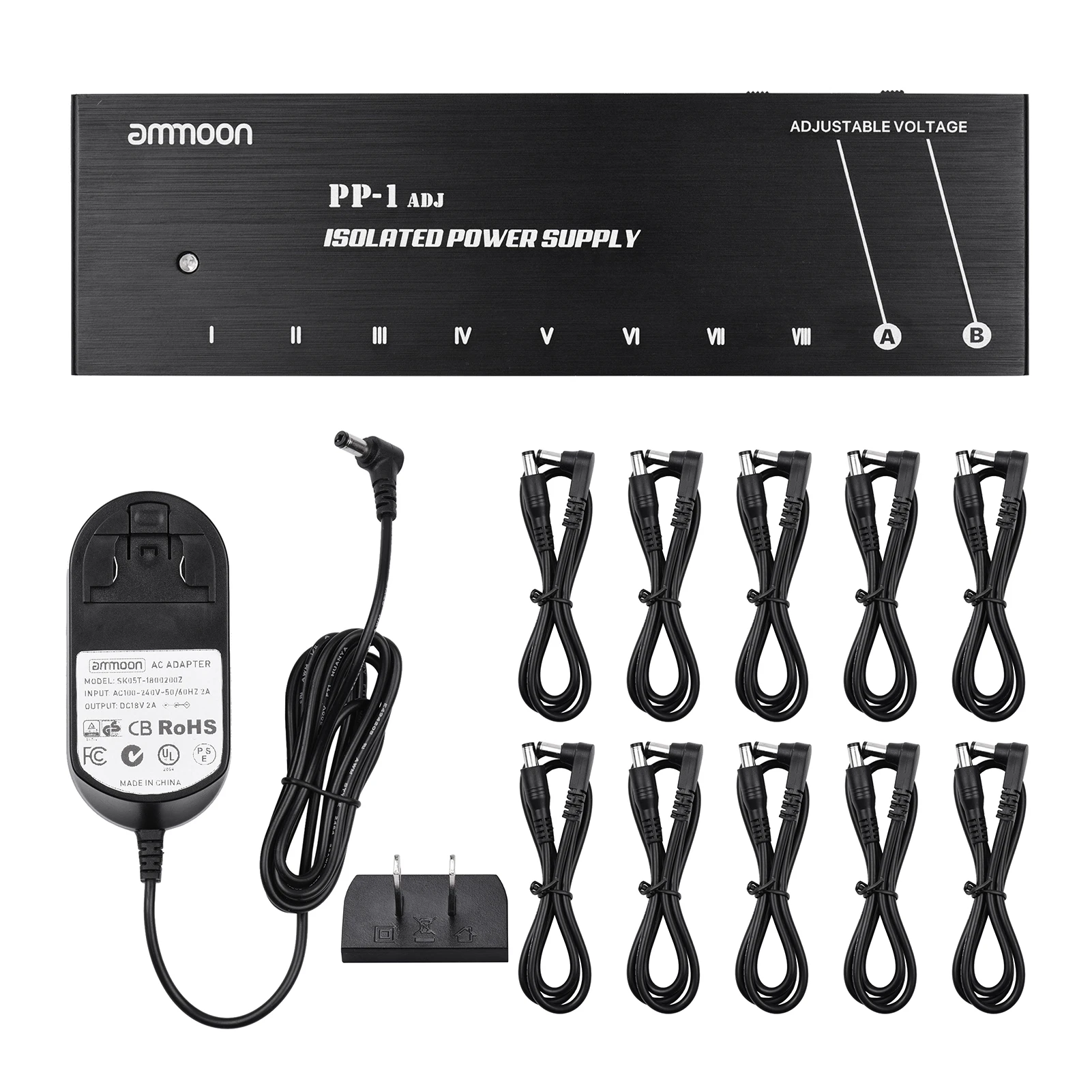 Стабильные выходы питания 9 в:Одна выходная мощность 9 в 1 А (макс.) для цифрового гитарного усилителя низкой мощности; Семь выходов мощности 9 в 500 мА (макс.) для большинства педалей цифрового эффекта.
