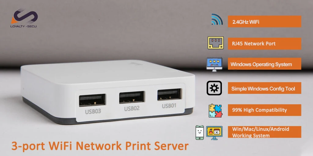 LY-MPS-WN03-этоБеспроводной WiFi сетевой сервер печати wБлагодаря 3 интерфейсами USB 2,0, Это внешнее устройство, которое можно использовать для совместного использования одного или нескольких принтеров несколькими пользователями беспроводной сети одновременно. WiFi Printer Server позволяет пользователям отправлять задания на печать на один или несколько удаленных принтеров в любое время в любом месте через компьютер или смартфон. СLOYALTY-SECU3-портовый беспроводной USB-сервер печати, на котором вы можете выбрать наиболее удобное место для хранения принтеров, будь то дома или в офисе, и больше не сдерживается длиной USB-кабеля.
