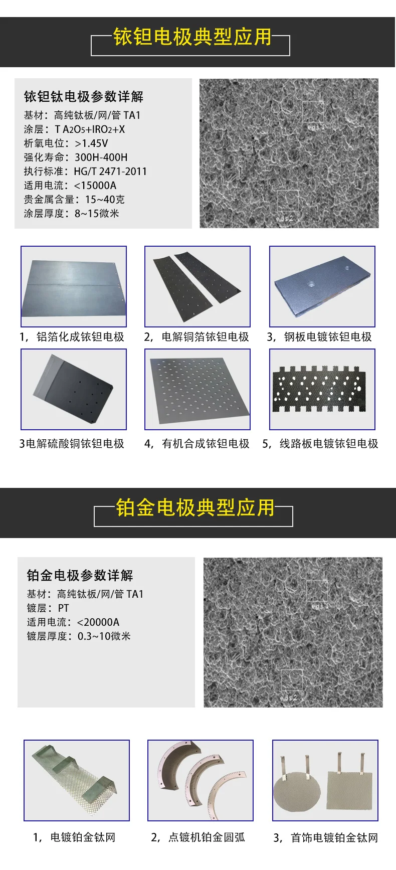 Характеристика: 1. Высокая коррозионная стойкость, хорошая полярность разворота производительности. 2. Высокая эффективность тока, по сравнению с графитовым анодом, потребление энергии очень низкое. 3. Длительный срок службы, в хлорщелочной промышленности, срок службы до 8 лет. 4. После деактивации электрода Матрица может быть повторно использована. Данные испытаний хлорщелочной промышленности: 1. Потенциал развития хлора: ≤ 1,13 в 2. Поляризация эволюции хлора: ≤ 40 МВ 3. Увеличенный срок службы: ≥ 3000 мин ток density10000A/m2
