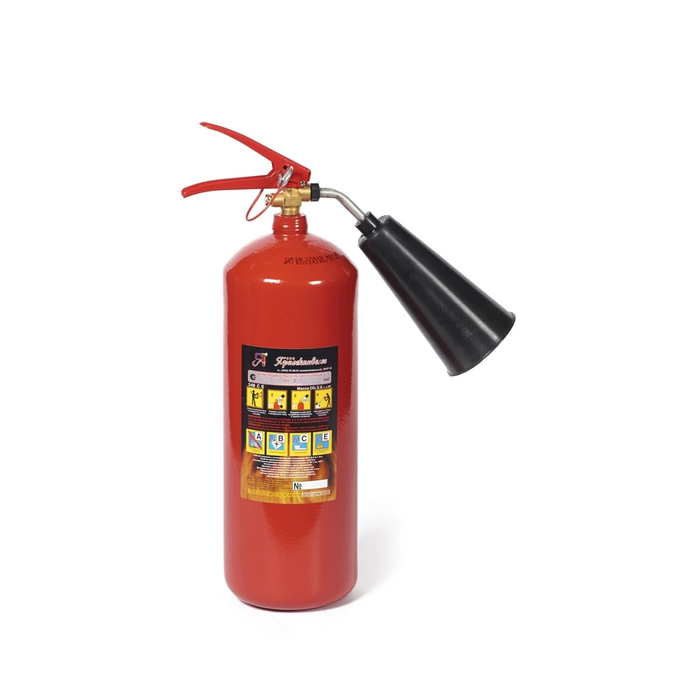 Масса заряда огнетушащего вещества 2 кг. Ранг по модельным очагам 21В, С, Е (до 10000 В). Углекислотный огнетушитель предназначен для быстрого охлаждения поверхности и рассеивания газа. Благодаря действию диоксида углерода материальные ценности практически не разрушаются, на них не остается разводов и пятен. Возгорание прекращается за счет охлаждения области горения. Огнетушитель особенно эффективен для локализации пожара на начальной стадии и тех видов возгорания, где запрещено применение воды. Углекислотный огнетушитель ОУ-2 предназначен для тушения веществ, горение которых не может происходить без доступа воздуха: В горючие жидкости; С горючие газы; Е электрооборудование под напряжением до 10000 В. Огнетушитель ОУ-2 не предназначен для тушения твердых веществ (класс А), а также для локализации возгораний металлов и прочих материалов, способных гореть без доступа воздуха. Такой огнетушитель рекомендуется для оснащения: - помещений с компьютерной техникой и оргтехникой, серверных комнат; - транспорта (автомобили, городской транспорт); - электроустановок, находящихся под напряжением до 10000 В и щитов управления; - музеев, выставок, картинных галерей и пр. Особенности применения углекислотного огнетушителя ОУ-2: 1. При тушении запрещено держаться за раструб огнетушителя и подносить его (раструб) к открытому пламени ближе, чем на 1 м. 2. После использования огнетушителя в закрытом помещении необходимо проветривание. В противном случае возможно отравление парами углекислоты. 3. Углекислотный огнетушитель нельзя использовать для тушения горящего человека (во избежание обморожения) 4. Углекислотные огнетушители ОУ-2 применяются для тушения следующих веществ: - горючие жидкости (В); - горючие газы (С); - электрооборудование (Е), находящееся под напряжением до 10 000 В. Углекислотные огнетушители ОУ-2 не применяются для тушения: - твердых горючих веществ (А); - веществ, горение которых может происходить без доступа кислорода (Д), (алюминий, магний и их сплавы, натрий, калий); - электроустановок напряжением выше 10 000 В. Устройство и принцип работы огнетушителя Углекислотный огнетушитель ОУ-2 – закачной огнетушитель высокого давления с зарядом жидкой двуокиси углерода (по ГОСТ 8050-85), находящейся под давлением насыщенных паров. Вместимость корпуса ОУ-2 составляет 2,68 л, масса заряда — 2 кг. Он рассчитан на тушение объекта возгорания в течение 6 секунд при длине струи 2 м. Работа огнетушителя ОУ-2 основана на вытеснении заряда двуокиси углерода под действием собственного избыточного давления, которое создается при наполнении огнетушителя. Двуокись углерода находится в баллоне под давлением 5,7 МПа (60 кгс/см2) при температуре окружающего воздуха +20°С. Максимальное рабочее давление в баллоне при температуре +50°С, не должно превышать 14,7 МПа (150 кгс/см2). Огнетушащее действие углекислоты основано на охлаждении зоны горения и разбавлении горючей паровоздушной среды инертным (не горючим) веществом до концентраций, при которых происходит прекращение реакции горения. Указания по эксплуатации, техническому обслуживанию и меры безопасности Огнетушитель ОУ-2 необходимо размещать в легкодоступных и заметных местах, где исключено попадание на него осадков, прямых солнечных лучей или нагрев огнетушителя выше 50 °С. Эксплуатация огнетушителя без чеки и пломбы завода и