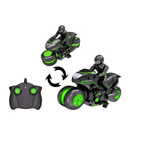 Радиоуправляемый трюковой мотоцикл осуществляет движение во всех направлениях: вперёд, назад, а также повороты вправо и влево. Помимо того, игрушка способна вращаться на 360 градусов вокруг своей оси, изменять положение колёс с вертикального на горизонтальное и совершать трюковое движение. На мотоцикле расположена фигурка водителя.