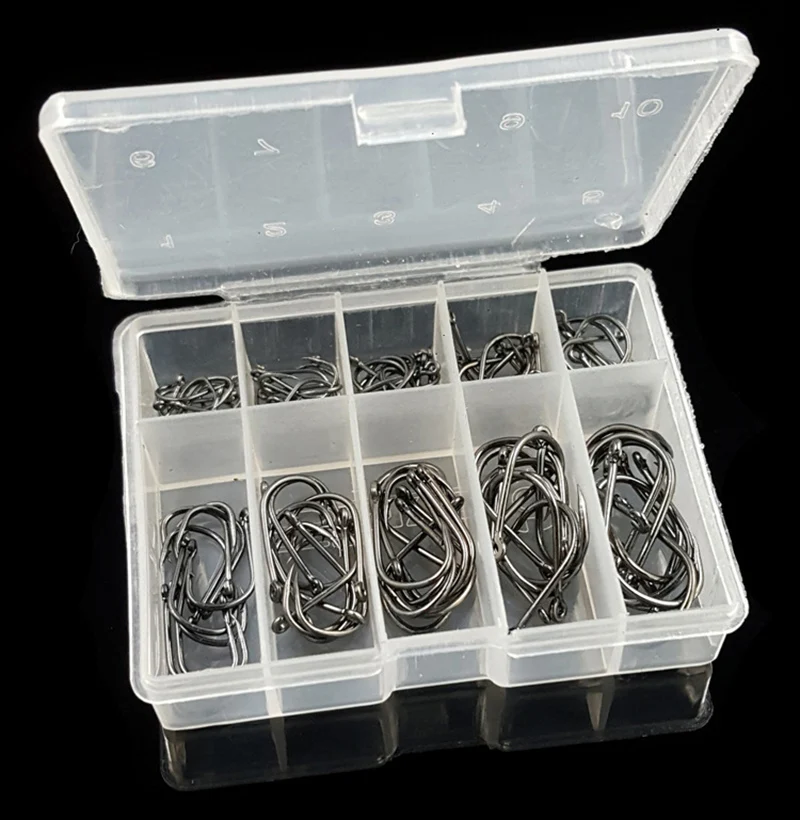 ①Includes 100pcs fishing hooks for you choose in different size from 3# to 12#.