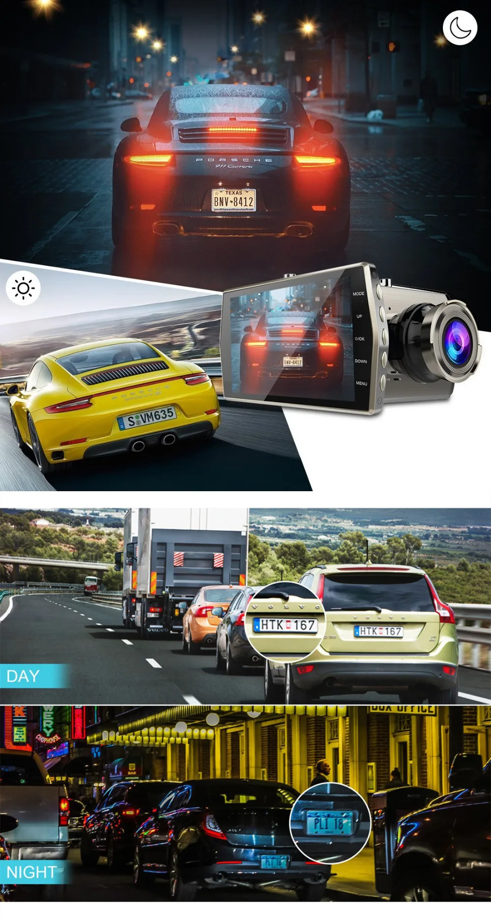 Видеорегистратор Full HD 1080P и усовершенствованная технология сжатия кодирования видео могут снимать четкие изображения в высоком разрешении днем и ночью.