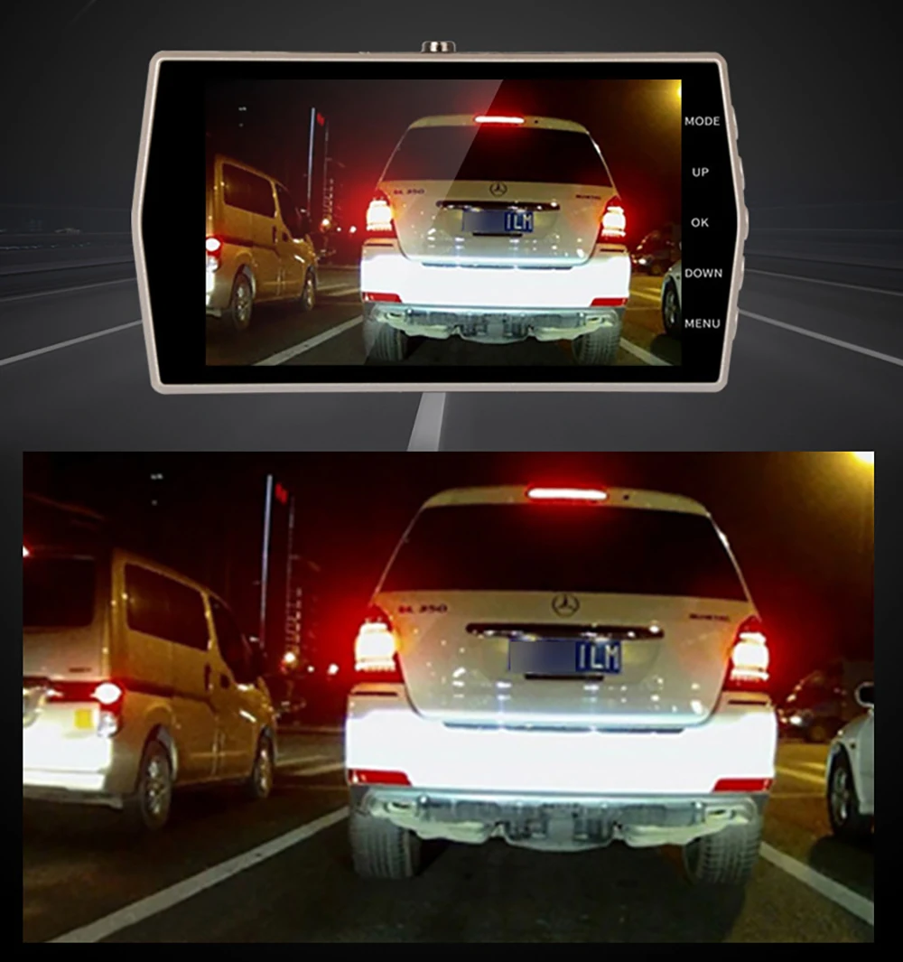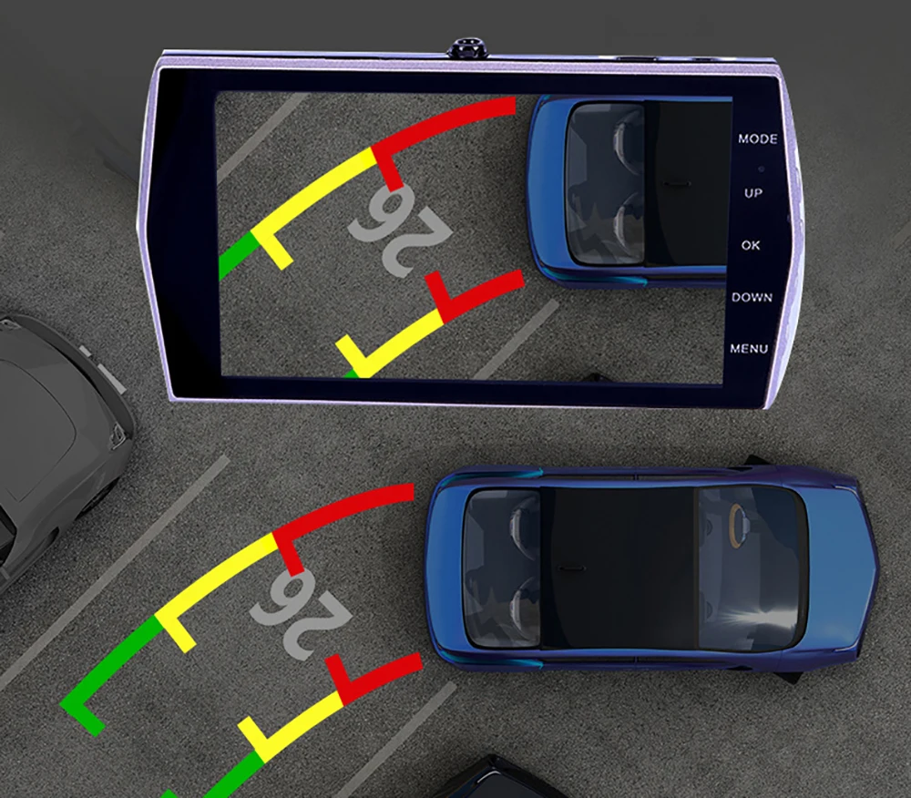 Когда автомобиль находится в обратной передаче, Автомобильный видеорегистратор автоматически переключается на камеру заднего вида с линией парковки, обеспечивает безопасность для парковки.