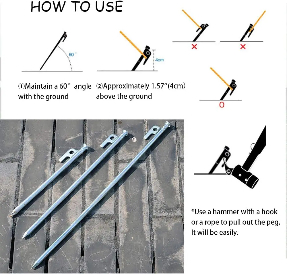 Простота в использовании: с острым наконечником позволяет легко водить кол в землю. Достаточно прочный, чтобы держать палатку против сильного ветра. Стальные кольи усердно работают во время отдыха на открытом воздухе, но они будут отдыхать, если вы хотите их вытащить. Просто используйте молоток, чтобы вытянуть брезент кольями через крючок или отверстие и принести их домой.