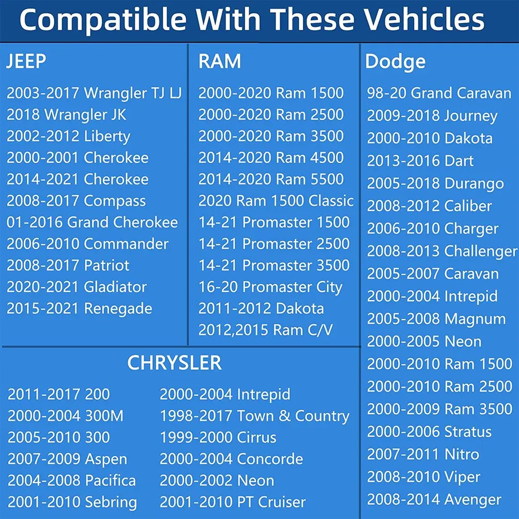 Подходит: 2003-2018 для Jeep Wrangler JK | 2003-2006 для Jeep Wrangler TJ | 2000-2017 Для Jeep Cherokee | 2008-2017 для Jeep Compass | 2002-2012 для Jeep Liberty | 2001-2013 для Jeep Grand Cherokee | 2006-2010 для Jeep Commander | 2008-2017 для Jeep Patriot | 2020-2021 для Jeep Gladiator | 2015-2021 для Jeep Renegade.