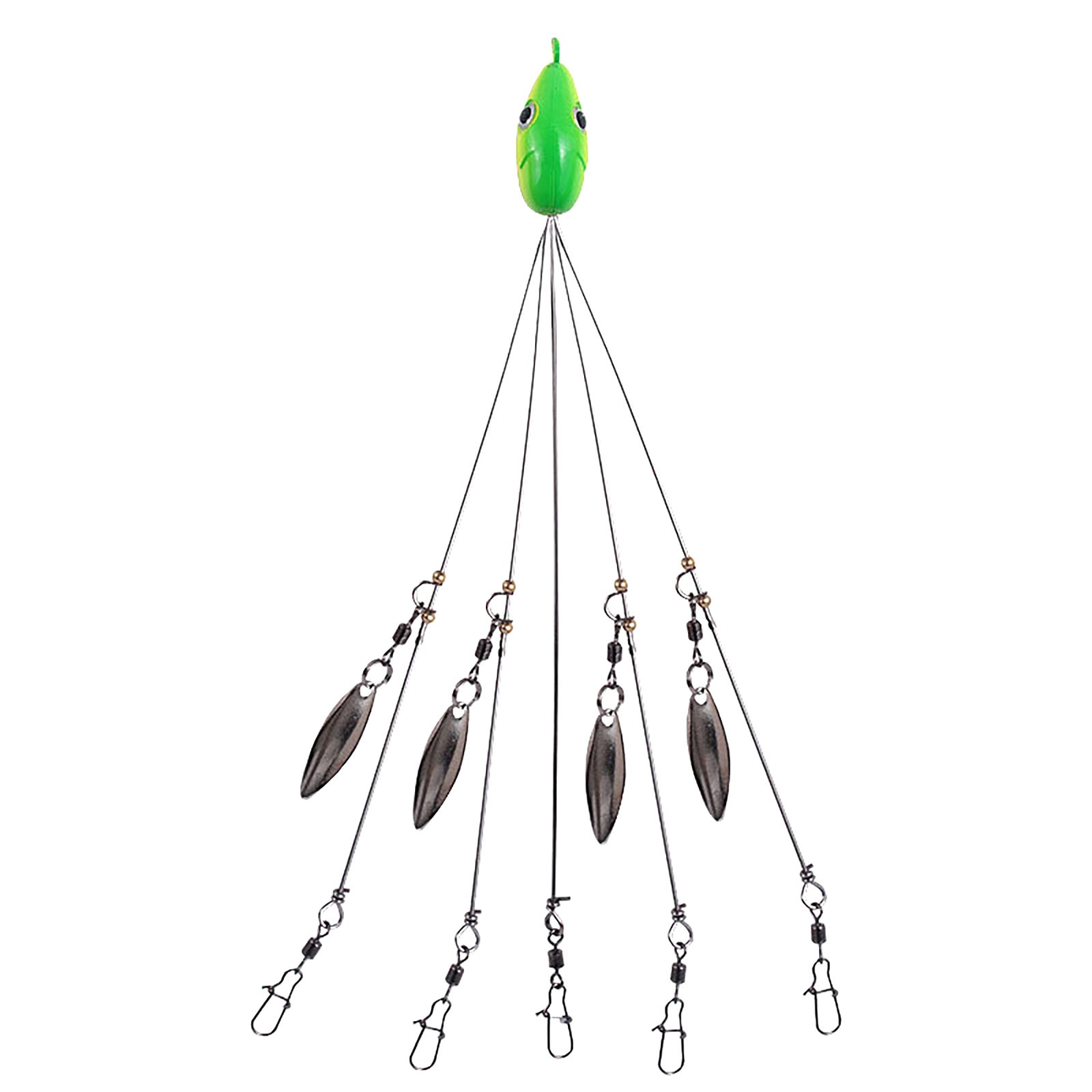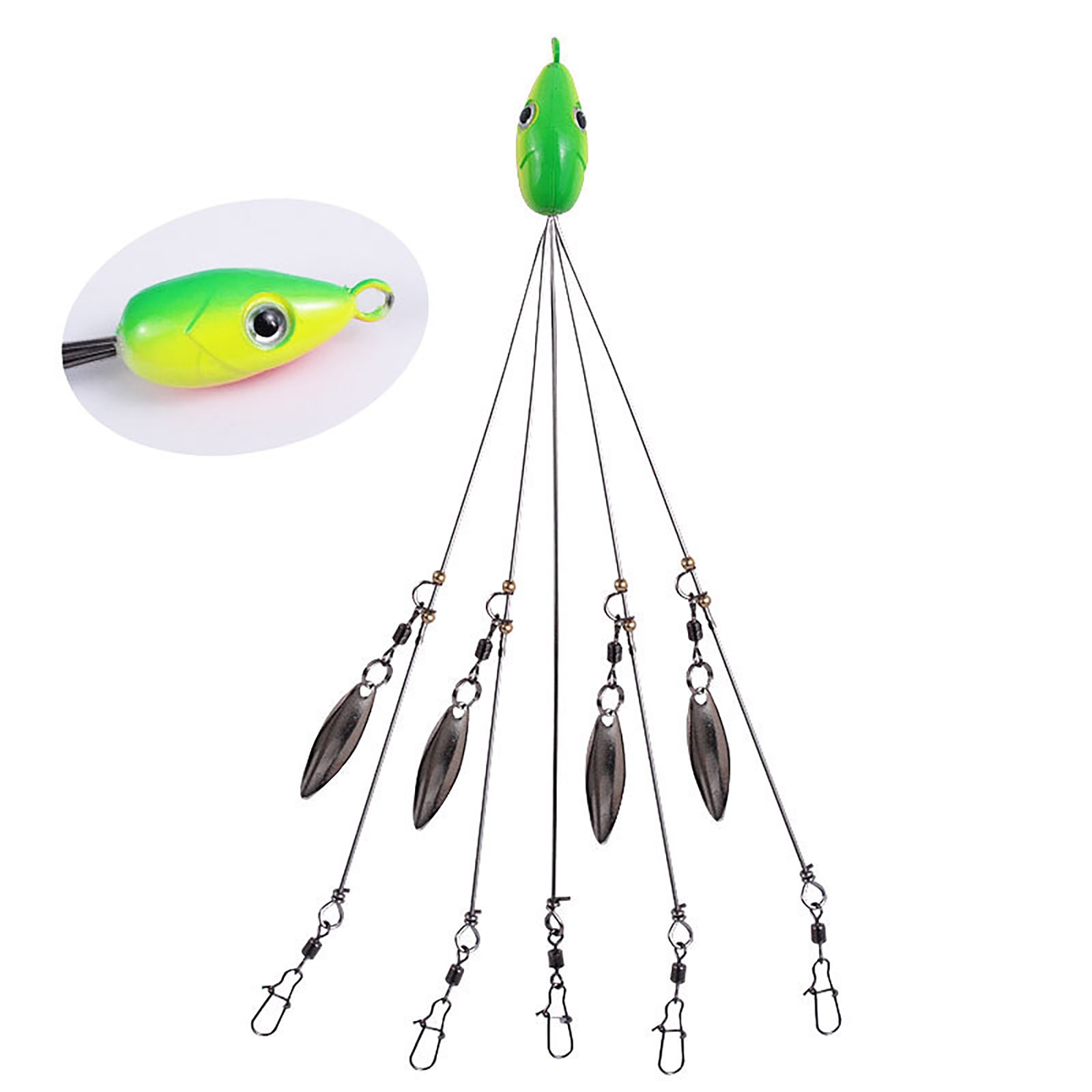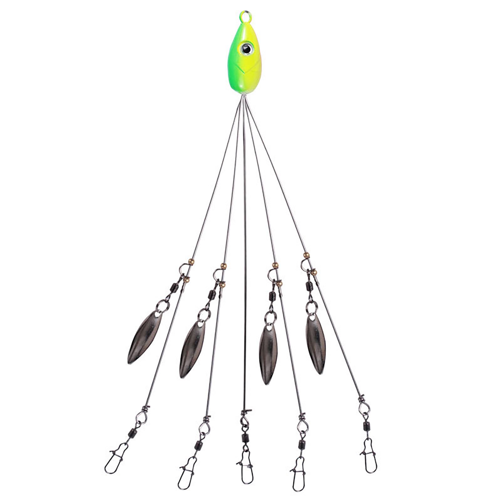 The shiny sinkers beneath the rig flash, even mimicking air bubbles just like a school of shad, making strikes hard to resist. It has designed for ultralight fishing, this rig lets you present all sorts of baits in many different ways. You can on additional scents and trolling lures for an extra bassy attraction while you rig your way to more fish at your favorite fishing spot. The fish will love it. You’ll love it too. It’s the perfect, proven way to catch fish all day long. Description: Material:Stainless steel Length:21cm Weight:16g Color:Orange,green,yellow,pink,blackQuantity: