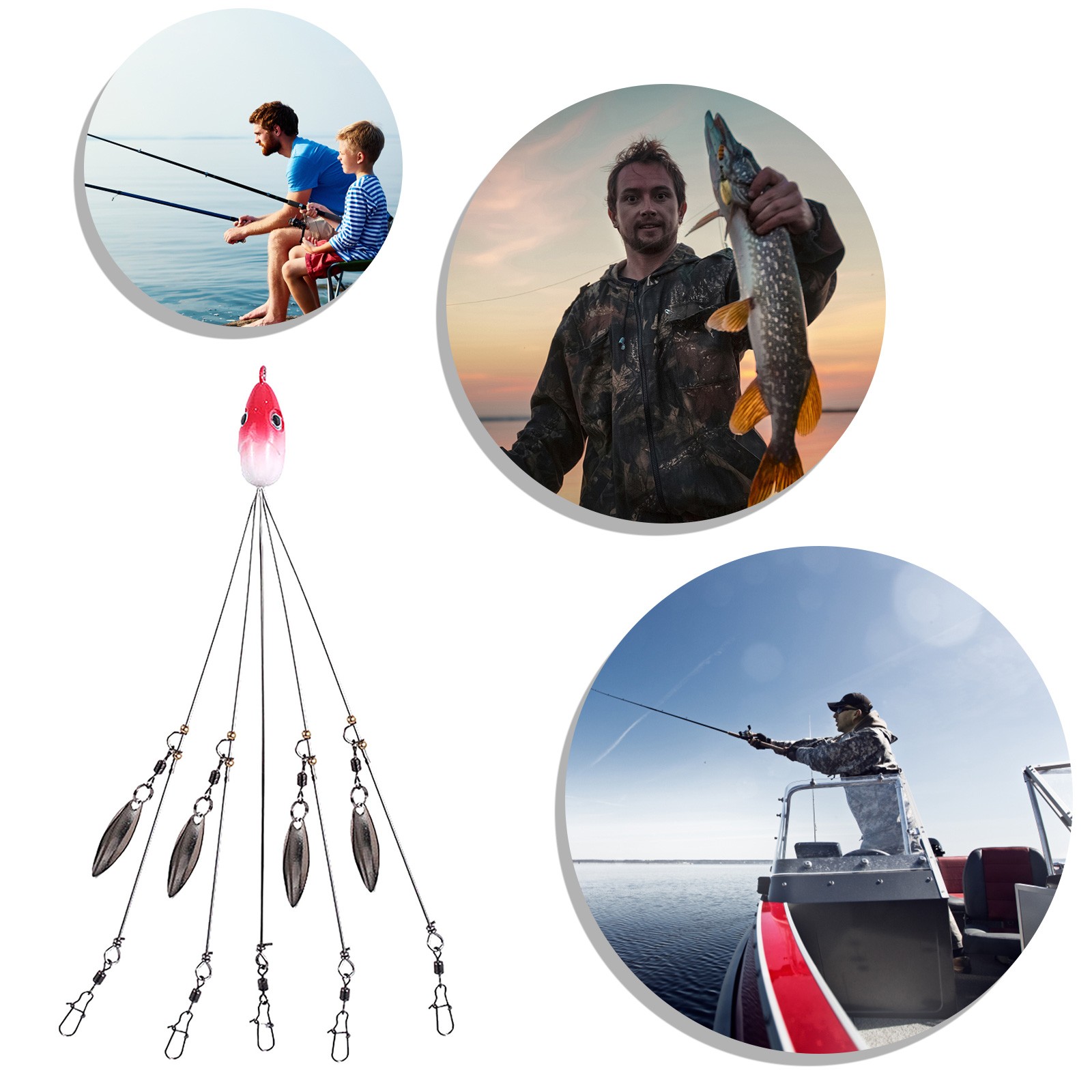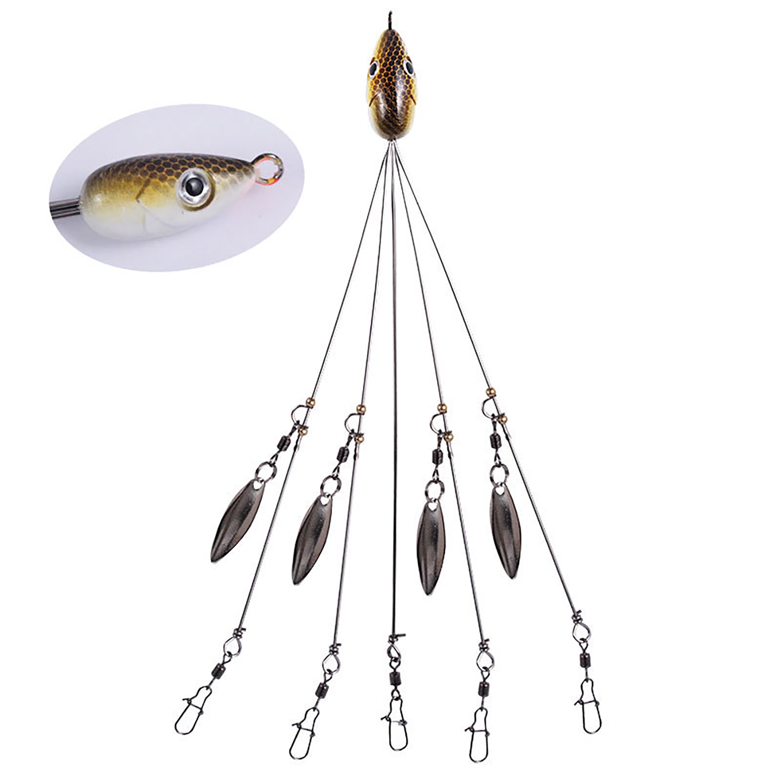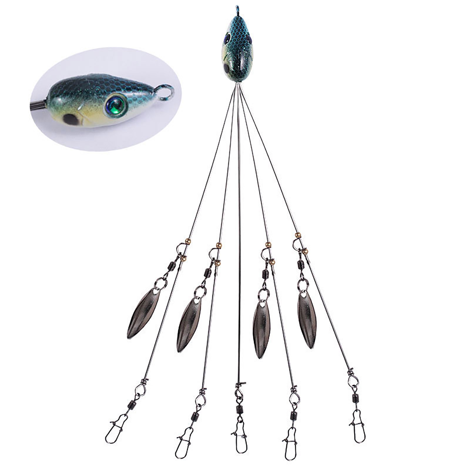 The shiny sinkers beneath the rig flash, even mimicking air bubbles just like a school of shad, making strikes hard to resist. It has designed for ultralight fishing, this rig lets you present all sorts of baits in many different ways. You can on additional scents and trolling lures for an extra bassy attraction while you rig your way to more fish at your favorite fishing spot. The fish will love it. You’ll love it too. It’s the perfect, proven way to catch fish all day long. Description: Material:Stainless steel Length:21cm Weight:16g Color:Orange,green,yellow,pink,blackQuantity: