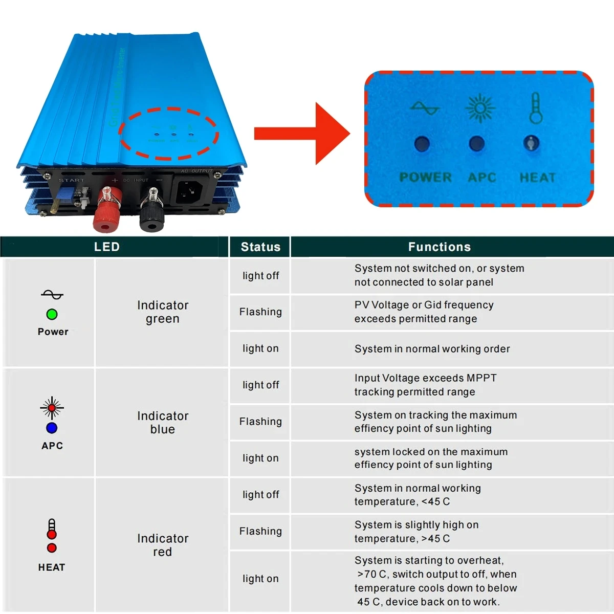 Режим ожидания-режим ожидания, когда устройство обнаруживает недостаточную подачу энергии с панели солнечных батарей, или устройство обнаруживает ненормальный статус, такой как напряжение, частоты и температуры, не в допустимом диапазоне, устройство переходит в режим ожидания.