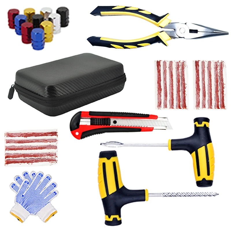 1 шт. инструмент для расчистки. 1 Игла инструменты 5 шт. ремонтные полоски. 1 шт. нож из нержавеющей стали 1 шт. манометр для шин 1 шт. плоскогубцы для носа с иглой 1 шт. устройство для удаления сердечника клапана 1 шт. автомобильный надувной быстрый соединитель 1 шт. аксессуар для хранения 1 пара нескользящих перчаток