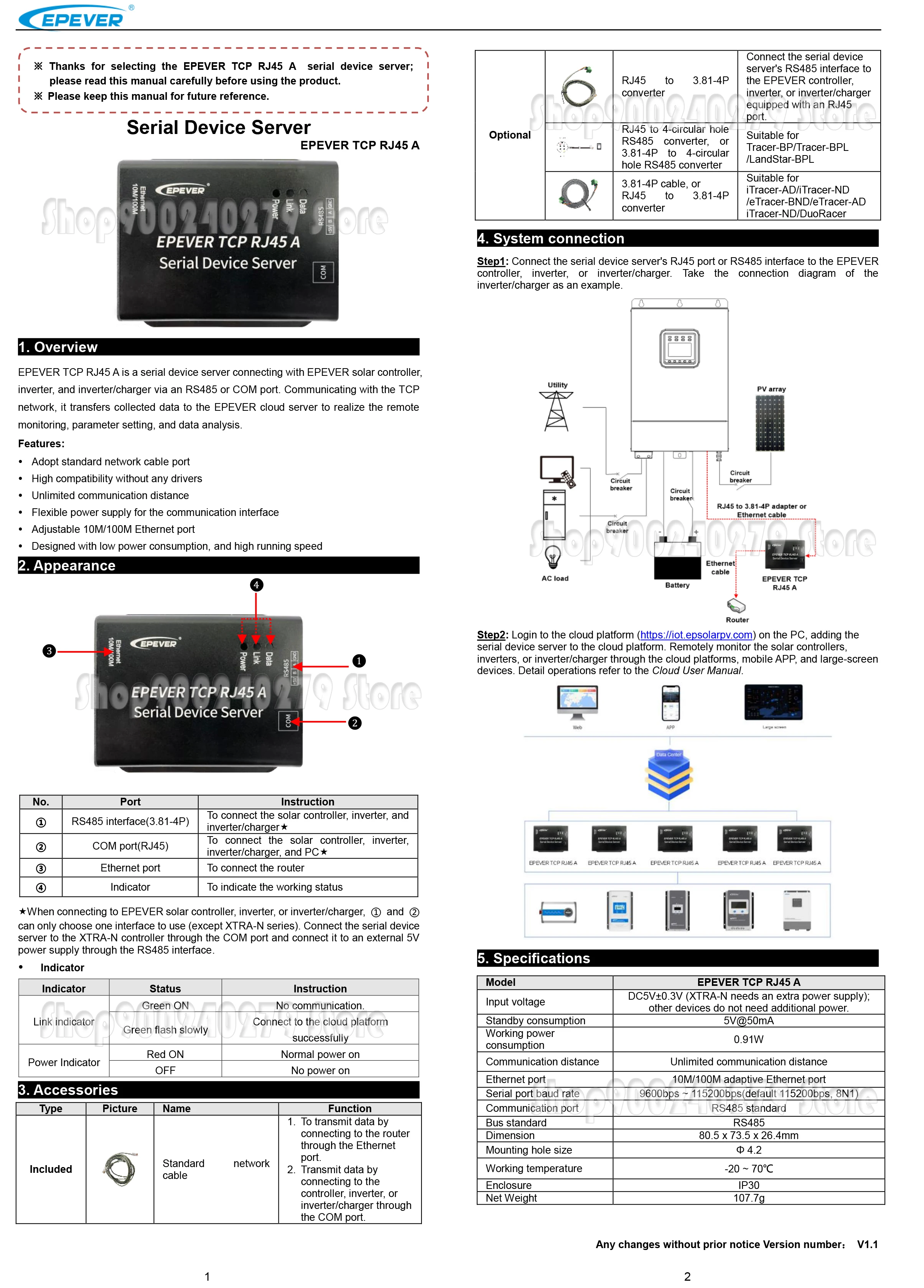 Сеть, Она передает собранные данные на облачный сервер EPEVER для реализации удаленного
