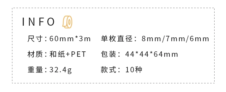 Тип: клейкая лента Материал: ПЭТ + Васи бумага Артикул: 10 видов конструкций Размер: 60 мм * 3 м Одиночный диаметр: 8 мм/7 мм/6 мм Количество: 1 шт. Вес: 32,4 г Посылка: OPP