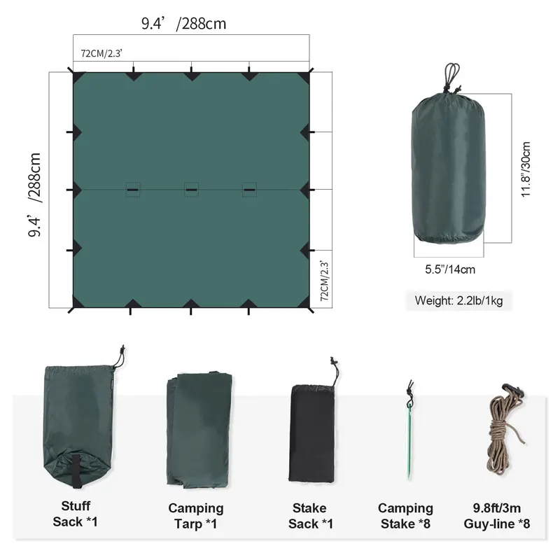 Брезент от дождя и мух-незаменимый предмет для опытных выходцев из-за их универсальности. Брезент для кемпинга BASTION имеет Водонепроницаемость 2000 мм и 19 точек крепления для использования в различных ландшафтах и походных условиях. Он составляет 9.4ft m2 (2.8m2) и может быть использован с гамаком или отдельно в качестве брезентового укрытия, предлагаем комфортное пространство для одного кемпера и неограниченную возможность наслаждаться дождем или блеском на открытом воздухе. Бастион поставляется с полным набором для установки световых отражающих резьбовых линий и кольев, с 20D водонепроницаемой обработанной нейлоновой тканью для прочной прочности и длительного использования.