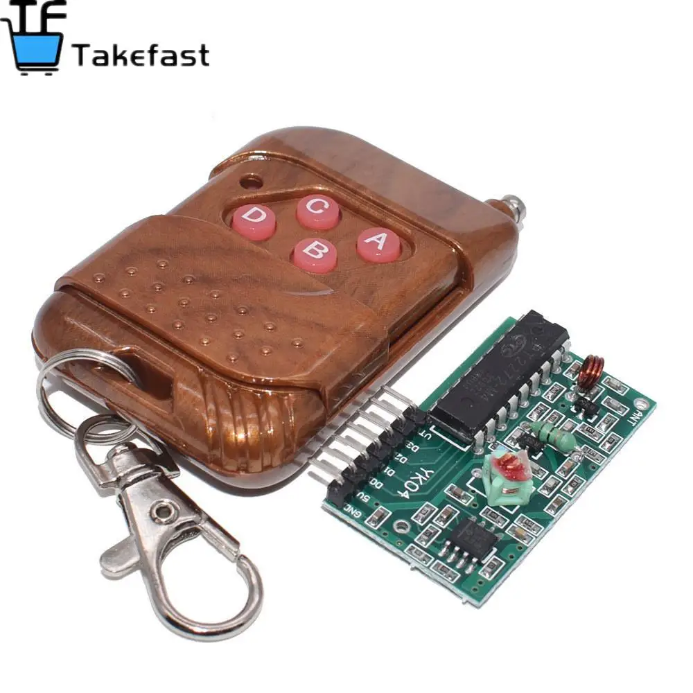 Пульт дистанционного управления 1. Рабочее напряжение: DC12V (27A/12V батарея x1 сосудов головного мозга) 2. Рабочий ток: 10 мА @ 12 в 3. Излучаемая мощность: 10 мВт @ 12 в 4. Режим модуляции: ASK (амплитудная модуляция) 5. Частота передачи: 315 МГц 6. Расстояние передачи: 50-100 м (открытое поле, чувствительность приемника-100 дБм) 7. Типы кодировщика: Фиксированный код с декодирующий ресивер 1.рабочее напряжение DC5V, чувствительность приемника is-98db. Leg 7 бит, соответственно, VT, D3, D2, D1, D0, the + 5 V и GND. VT является действительным сигналом с высоким выходным штифтом после получения действительного сигнала, штырьковый выход с высоким, также может управлять реле. 2. Размеры: 6,6*22*41 мм есть четыре кнопки на дистанционный пульт, и соответственно соответствуют четыре битов данных к плата приема выходной контакт D0, D1, D2 и D3. Нажмите кнопки передачи сигналов, соответствующий бит данных является высоким выходом.
