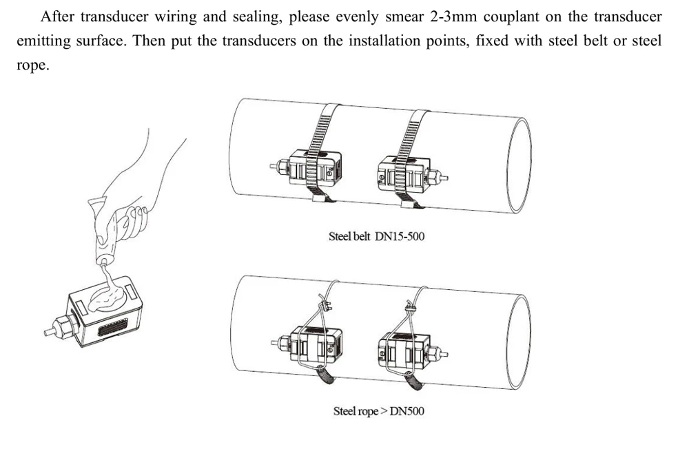 Вам необходимо нанести Соединительный агент на контактную поверхность преобразователя и трубопровода, как показано на рисунке: