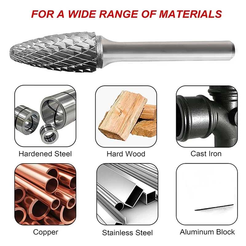 TUNGSTEN CARBIDE BURRS- Tungsten Carbide Rotary Burrs are widely used for cutting, shaping, grinding, sculpting, deburring, and chamfering of various materials (such as:all kinds of metals, steel, wood, acrylics, fibreglass, plastics, ceramics, stone).It is compatible with pneumatic rotary tools, high-speed engravers, flexible shafts, micro-motors, die grinders, drills, hobby rotary tools.