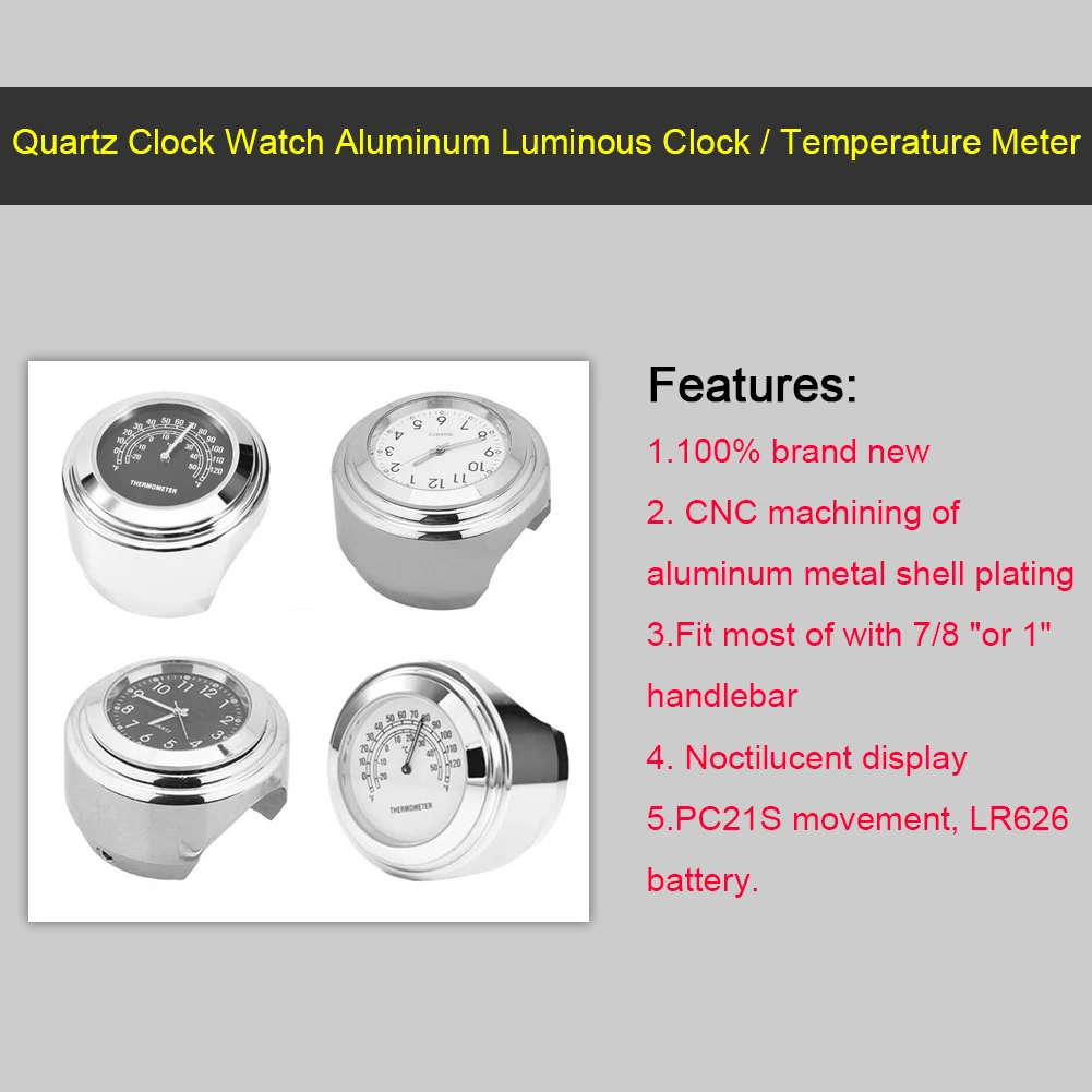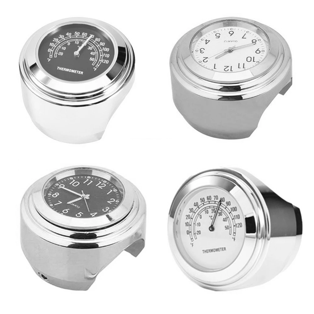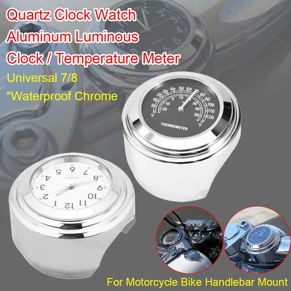 1 комплект, Универсальный руль для мотоцикла 7/8 ', крепление на руль, кварцевые часы, термометр, водонепроницаемый хром, мото руль, часы для мотоцикла, водонепроницаемые хромированные часы для мотоцикла, велосипеда, крепление на руль, кварцевые часы, алюминиевые светящиеся часы, мото Черные Аксессуары