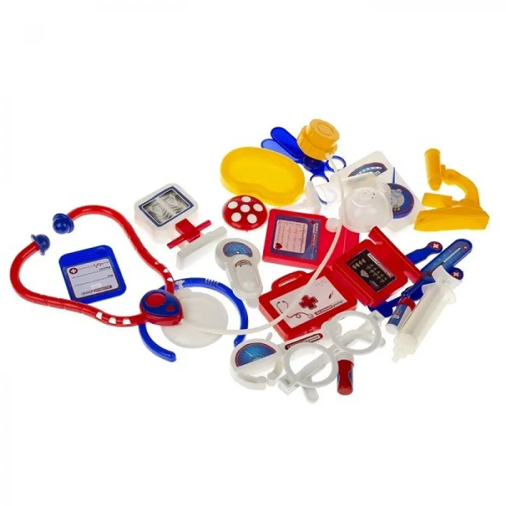 Детский набор Маленький доктор, в нем есть все необходимое для врача: очки, рентген аппарат, компьютер, измеритель пульса, 2 пилюли, шприц, стакан, ножницы, градусник, ложечка, скальпель, рефлектор, бейджик, фонендоскоп, ванночка и даже микроскоп. Все элементы набора изготовлены из высококачественного, прочного и долговечного пластика, безопасного для здоровья малыша.