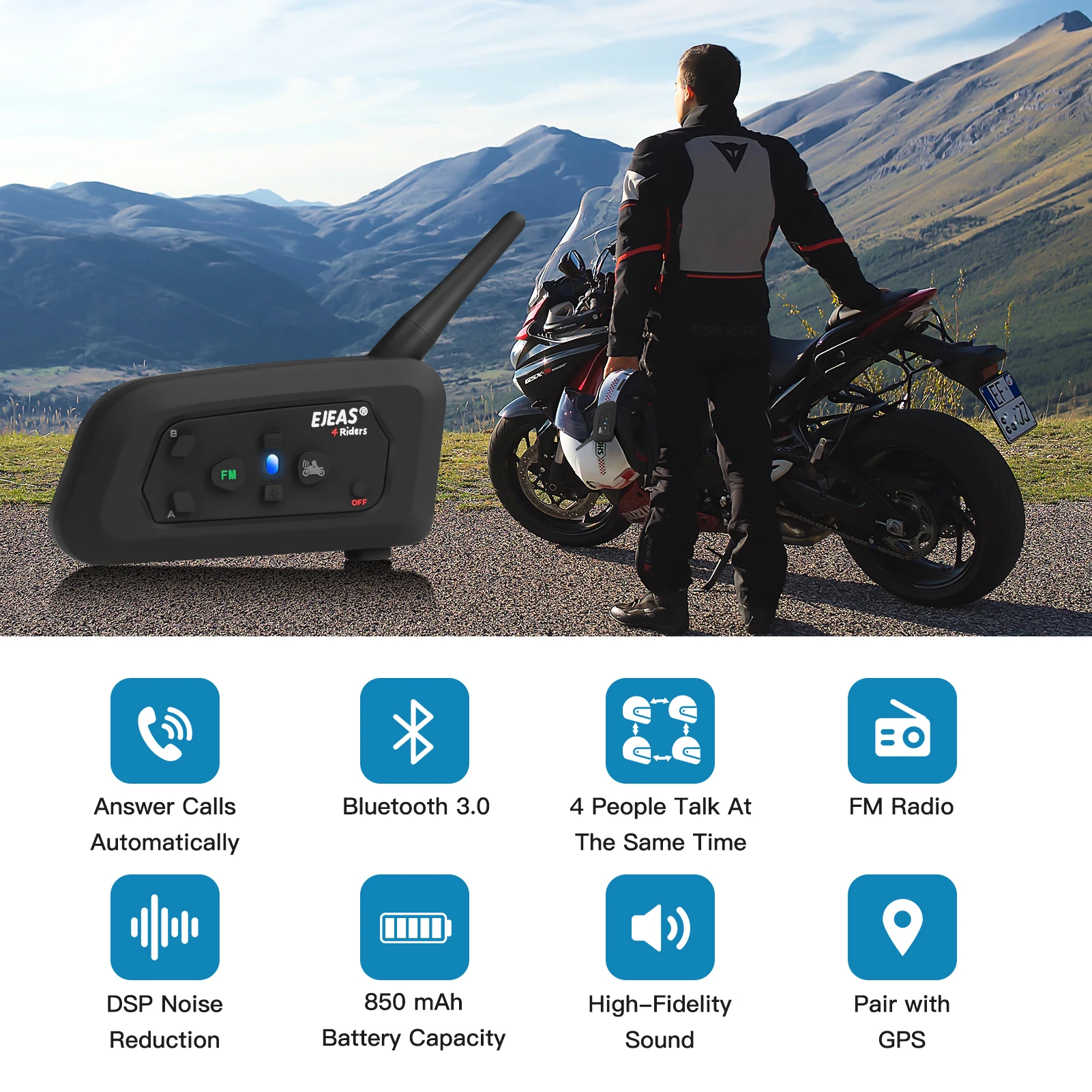 Bluetooth система, которая позволяет Макс. Позвоните нам по расстояние между двумя всадников до 1200 м и действительно понимает полностью дуплекс беспроводной связи между четырех Всадников.